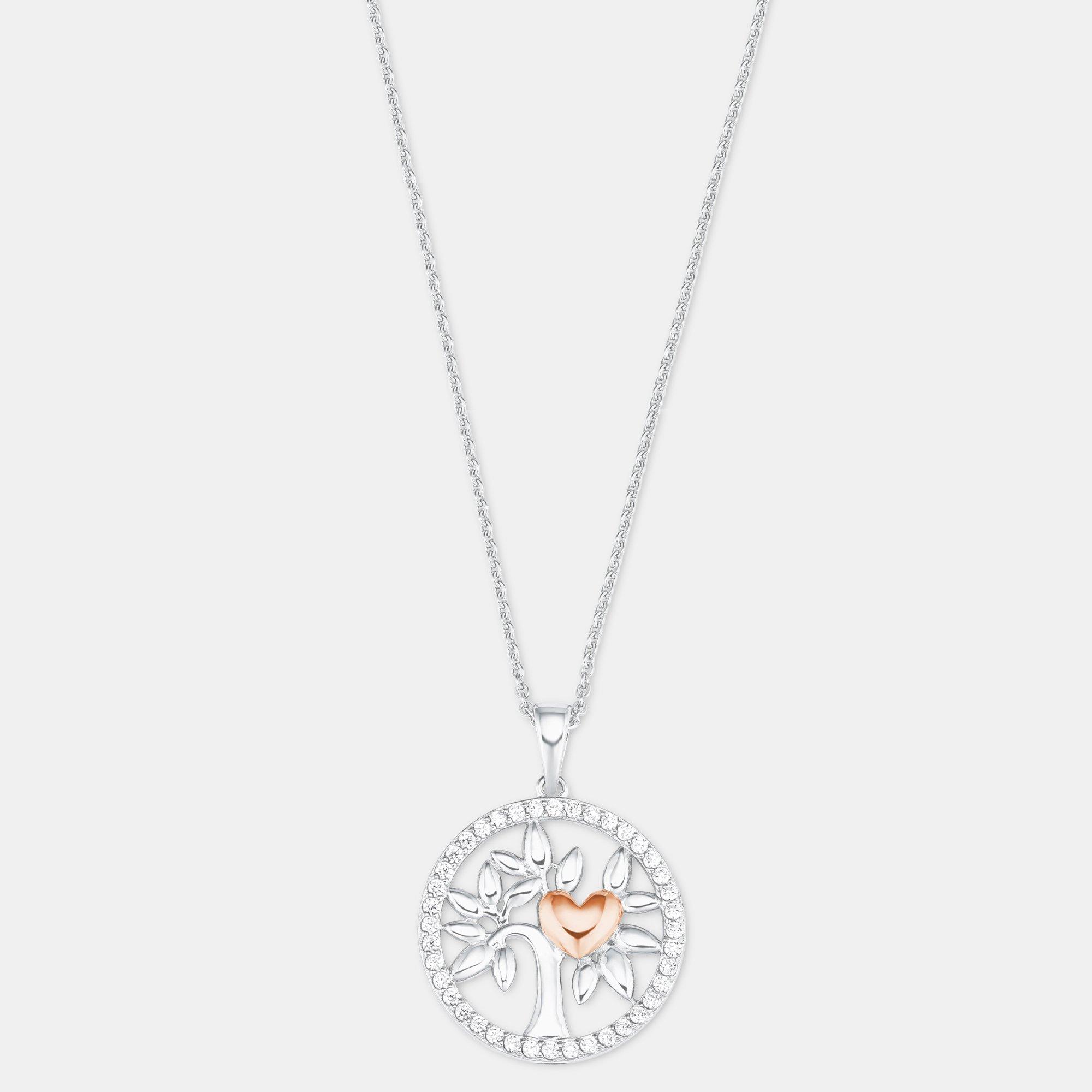 - Der Lebensbaum erstrahlt in Silber, das Herz inmitten gefällt in einer warmen Rosévergoldung, der Rahmen des Anhängers ist mit Zirkonia-Steinen verziert