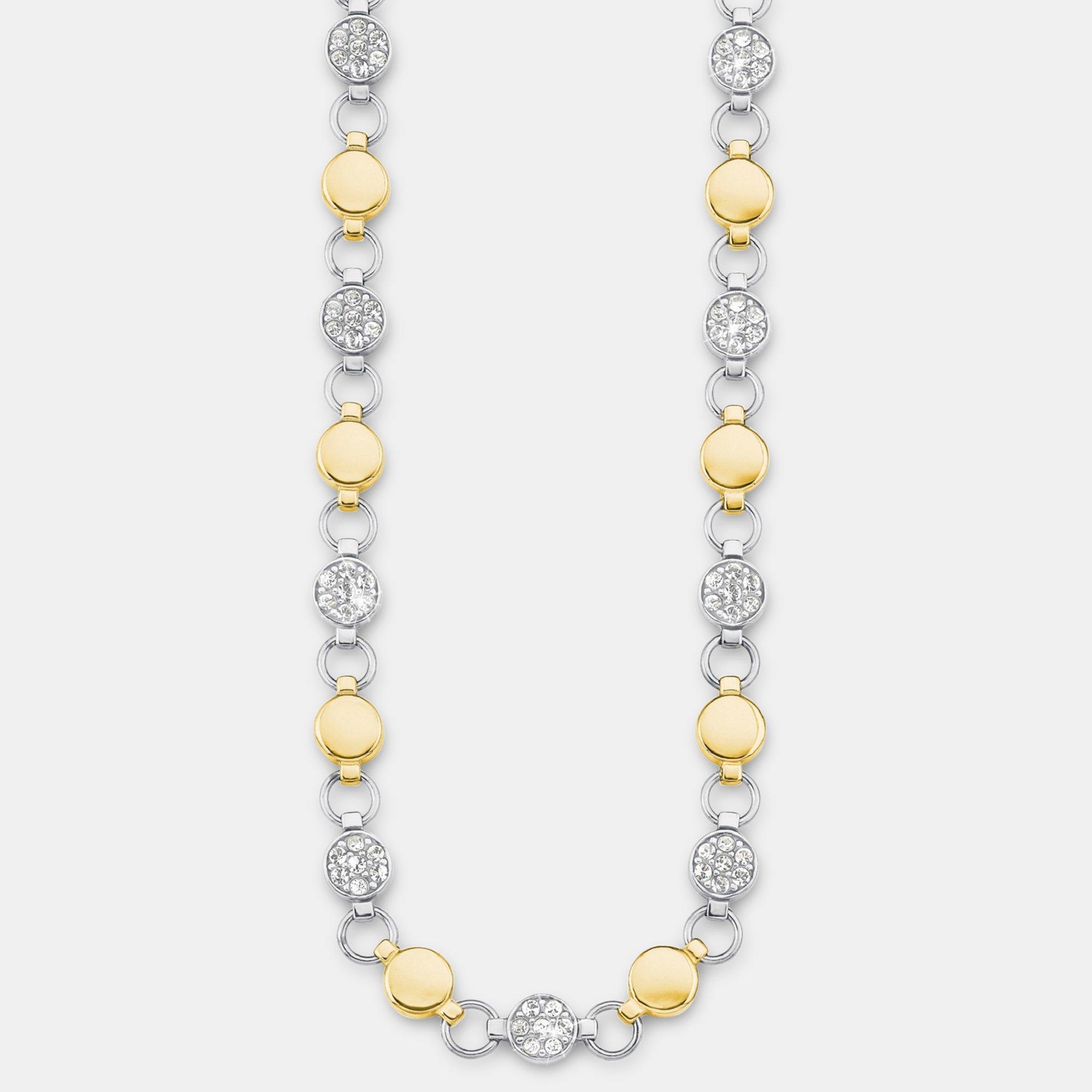 Aus einzelnen, runden Elementen besteht diese bezaubernde Halskette. Hochwertiger Edelstahl in grober Ausführung dominiert das Accessoire. Dabei veredeln Kristalle von Swarovski® in Weiss einzelne Glieder, während eine Ionenplattierung in Gold Glanzpunkte setzt und den zweifarbigen Look perfekt macht. Die Kette ist insgesamt 45 cm lang und verstellbar (42+3 cm Verlängerungskettchen).