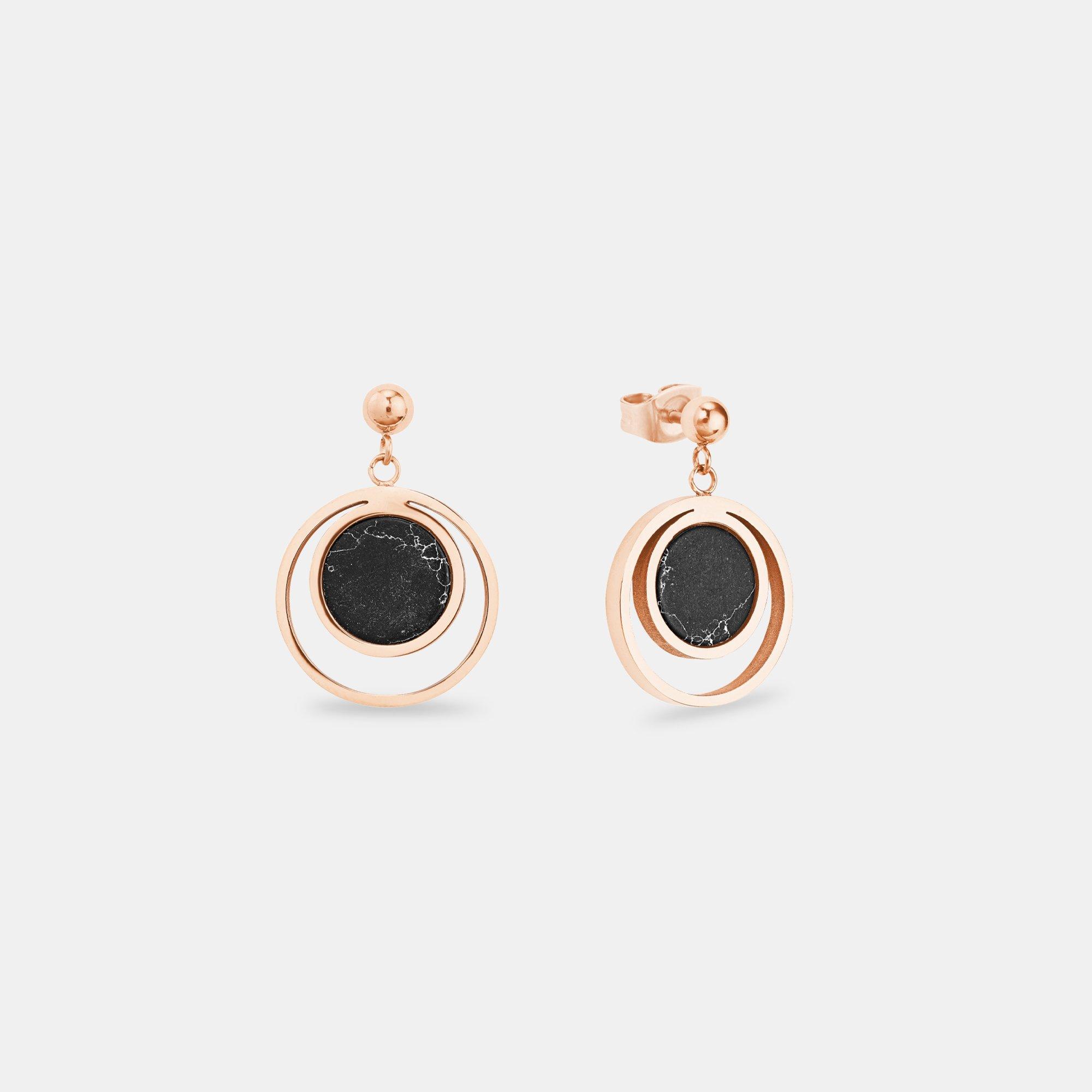 Kreise sind und bleiben weiterhin angesagt: s.Oliver kreiert ein Paar Ohrstecker in warmer Ionenplattierung Rosé, das sich mit einem schwarz marmorierten Türkisstein (synth.) zusammen tut und trendige Akzente setzt. Die doppelreihigen Ohrringe wurden aus hochwertigem Edelstahl gefertigt und besitzen ein Durchmesser von ca. 17 mm. Mit dem einfachen Steckverschluss lässt sich der Ohrschmuck einfach anlegen und garantiert der Hit an jedem Outfit zu sein!