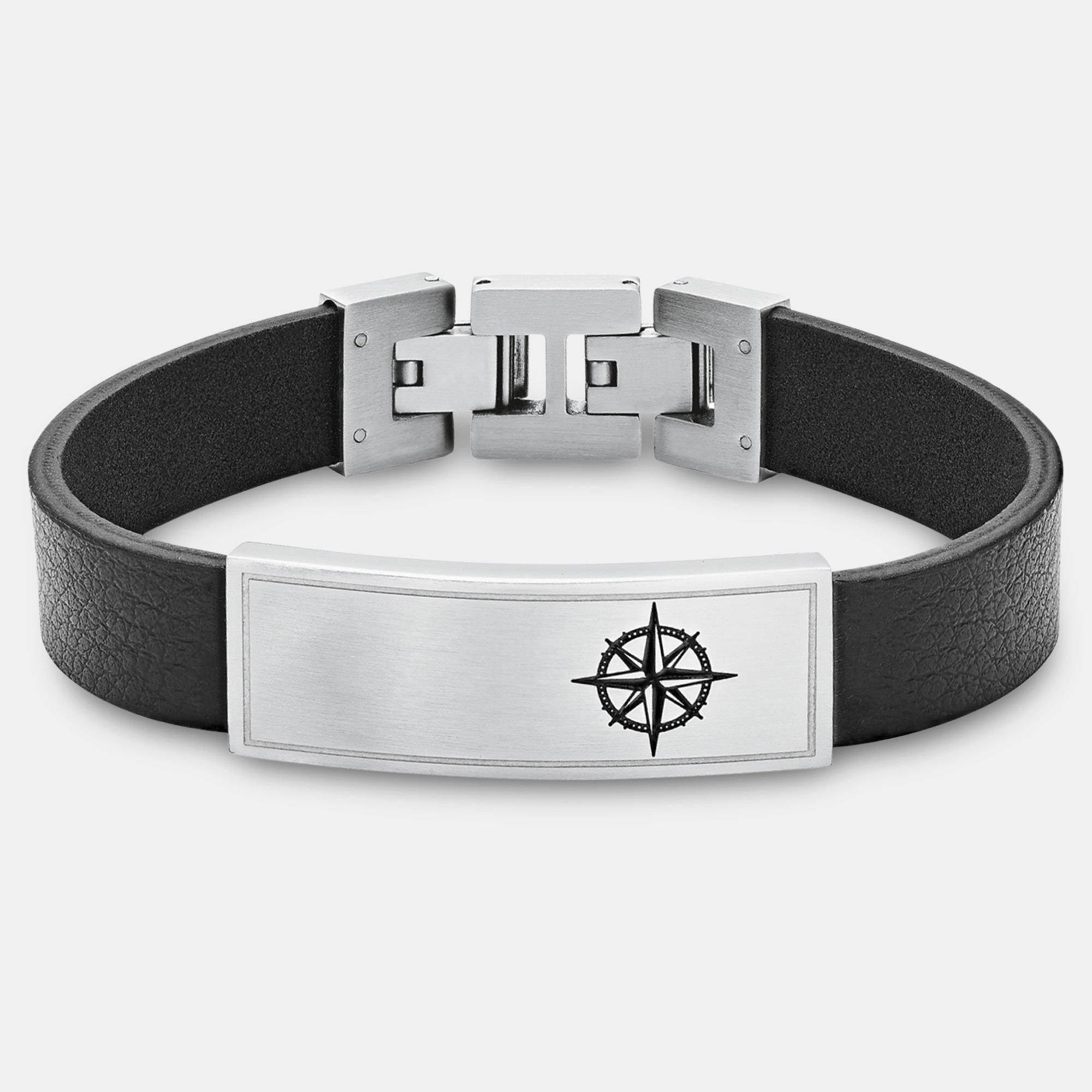 Ident Armbänder sind stets lässige Begleiter und eignen sich, versehen mit einer persönlichen Gravur, ideal als Geschenk. Dieses Modell ist für besonders reisefreudige Männer, denn auf der gravierbaren Fläche findet ein fein detaillierter Kompass ihren Platz. Gefertigt aus schwarzem Kalbsleder und hochwertigem Edelstahl, umfasst das Armband von s.Oliver Echtschmuck eine Länge von 21,5 cm. Durch Herausnehmen eines Gliedes kann das Armband auf 20 cm verkleinert werden. Ein Klappverschluss sorgt für ein praktisches und schnelles Verschliessen.