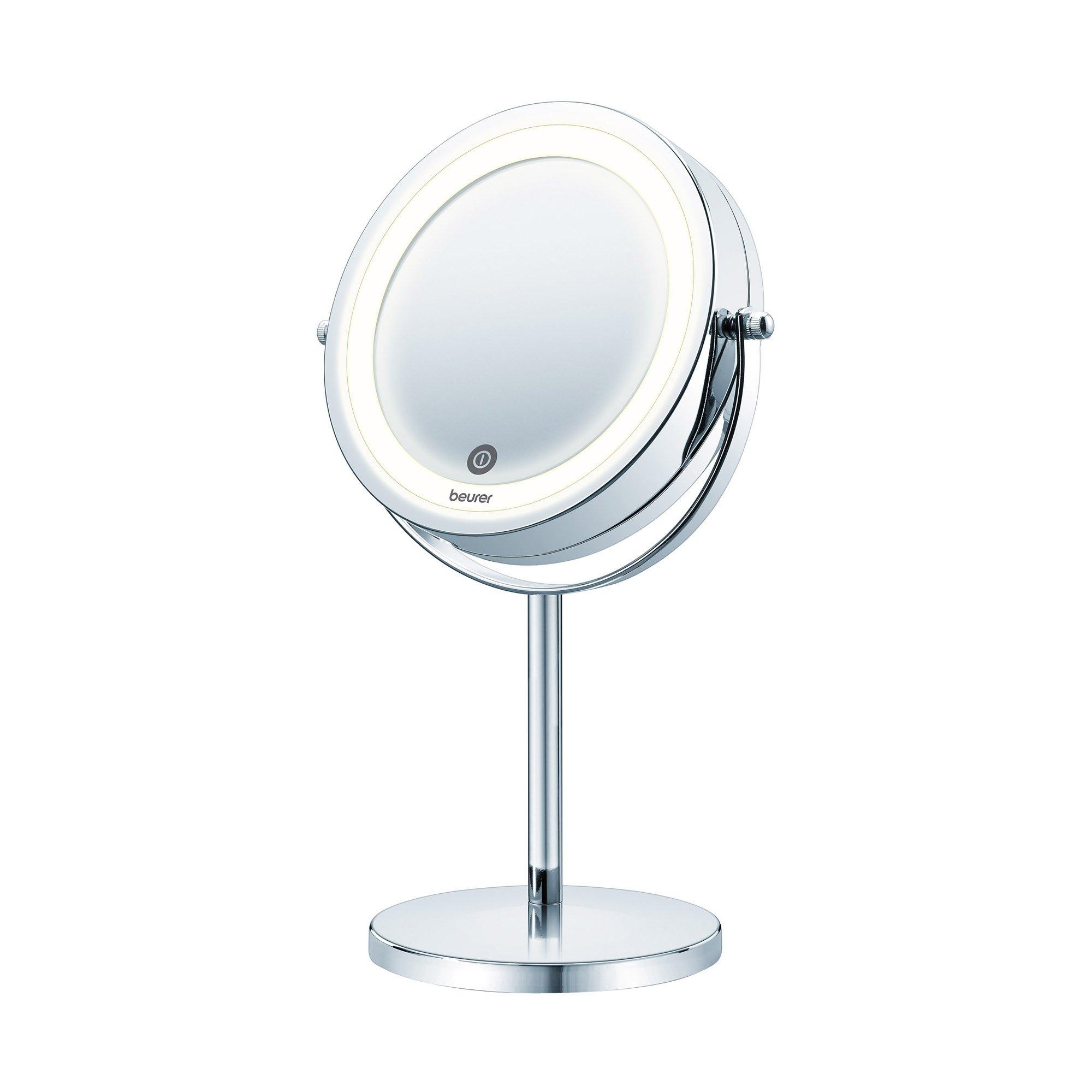 Drehbarer, beleuchteter Kosmetikspiegel BS 55 von Beurer. Ein normaler Spiegel und eine 7-fache Vergrösserung. Der Kosmetikspiegel hat eine stufenlose Dimmfunktion mit Touch-Sensor und hellem LED-Licht. Hochwertige Verchromung rundet das Produkt perfekt an.