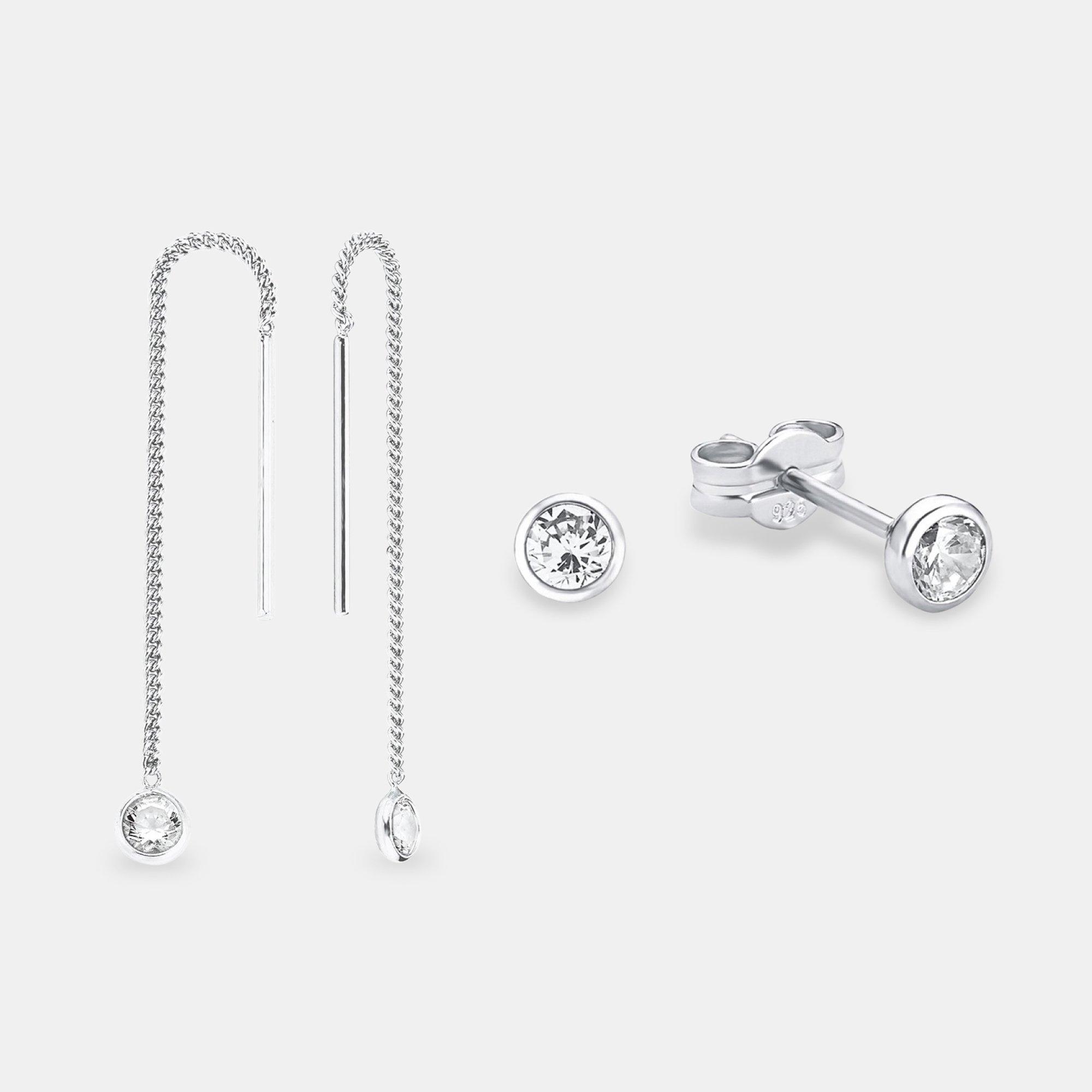 Das Damen Set besteht aus 2 absolut stimmigen Ohrringen: 6 cm lange Durchzieher mit Funkelfaktor und Basic Stecker. Echtsilber Schmuck mit Feingehaltsstempel 925.
