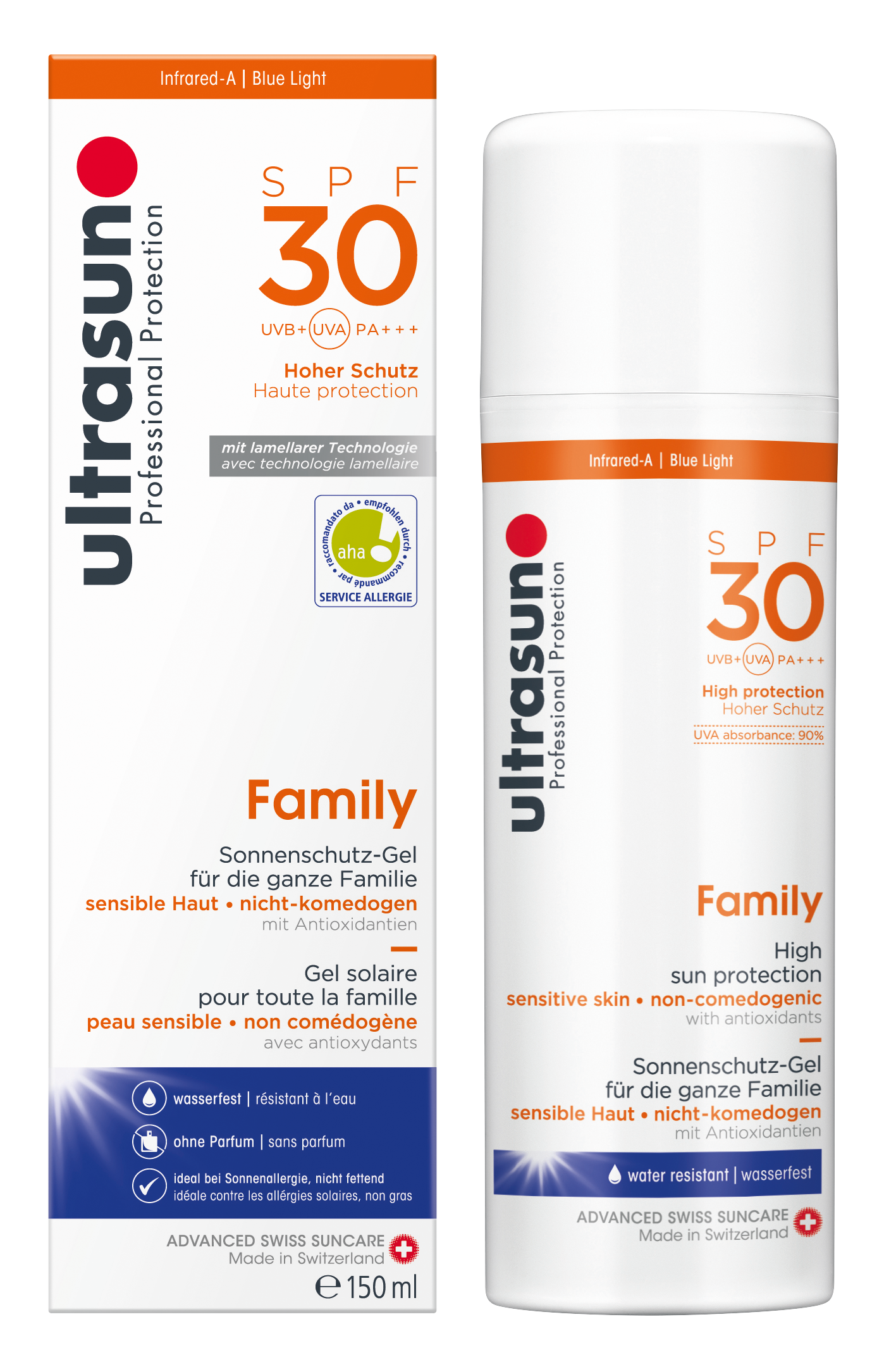 Schnell absorbierendes, nicht fettendes, nicht klebriges UVA und UVB (SPF30) Sonnenschutz Gel mit GSP für Infrarot-Schutz, Titandioxid zum Schutz vor blauem Licht und lamellarer Technologie – ideal für die ganze Familie und empfindliche Haut.