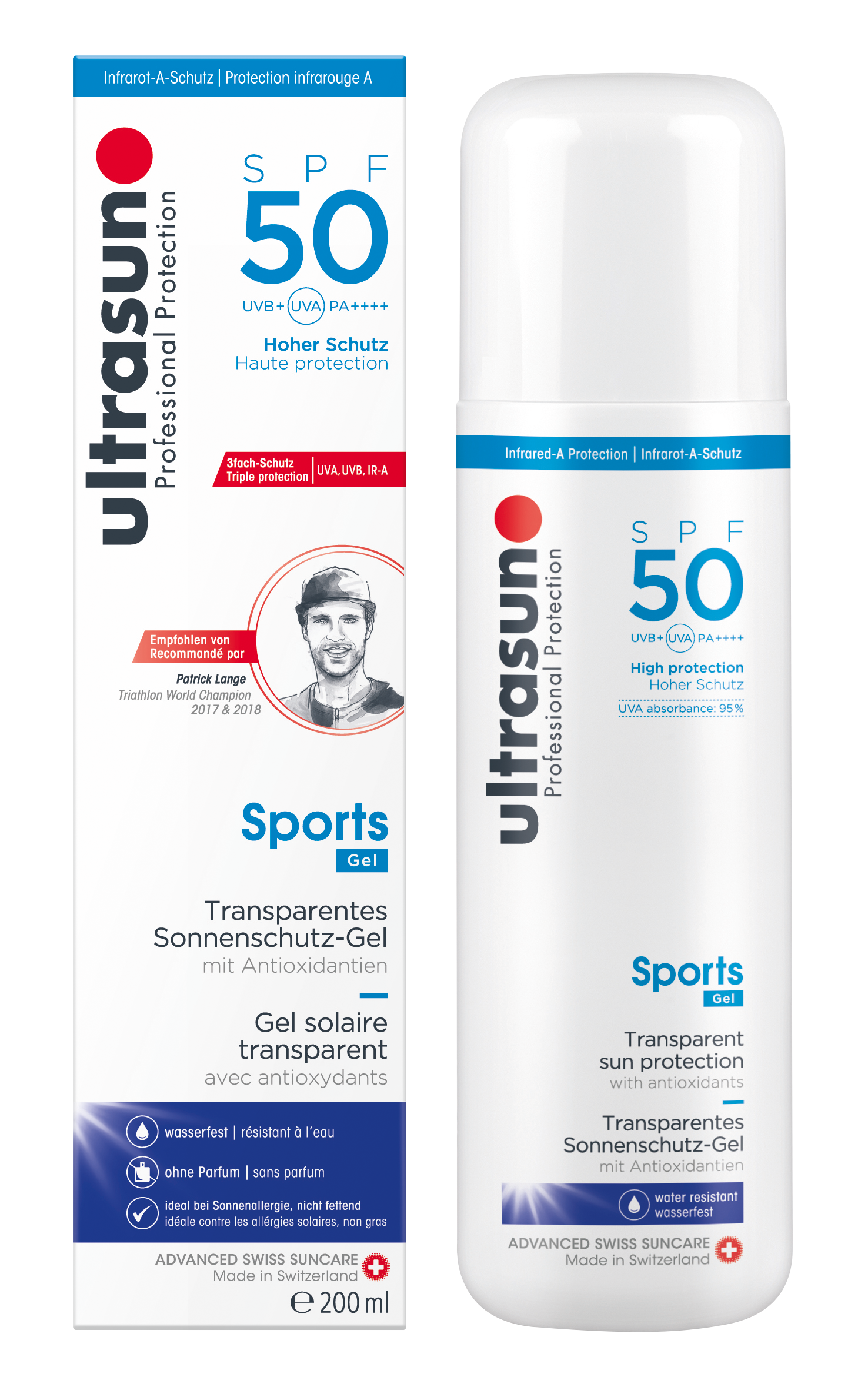 Schnell absorbierendes, nicht fettendes, nicht klebriges, transparentes UVA und UVB (SPF50) Sonnenschutz Gel mit GSP für Infrarot-Schutz – ideal für aktive SportlerInnen, schnell und einfach auftragbar. Entzündbar – enthält Alkohol.