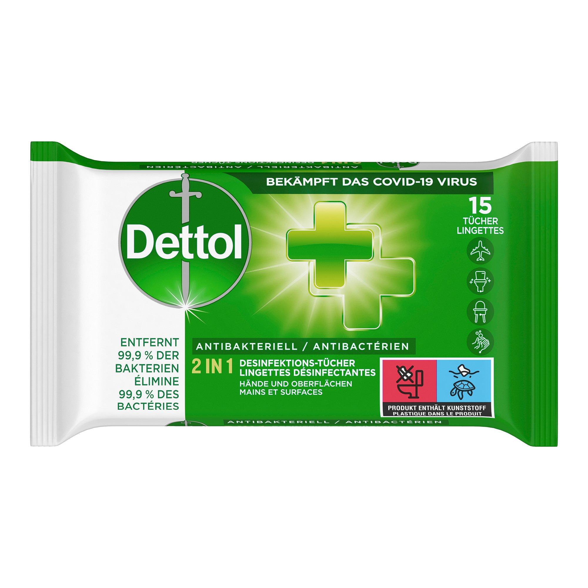 Dettol 2in1 DesinfektionsTücher sind der ideale Begleiter für hygienische Sauberkeit Unterwegs, denn sie entfernen zuverlässig 99,9 % der Bakterien an Händen und verschiedenen Oberflächen. Durch ihre handliche Grösse sind die Tücher praktisch für Unterwegs. Die samtweichen, frisch duftenden Tücher sind dermatologisch getestet und sanft zur Haut.