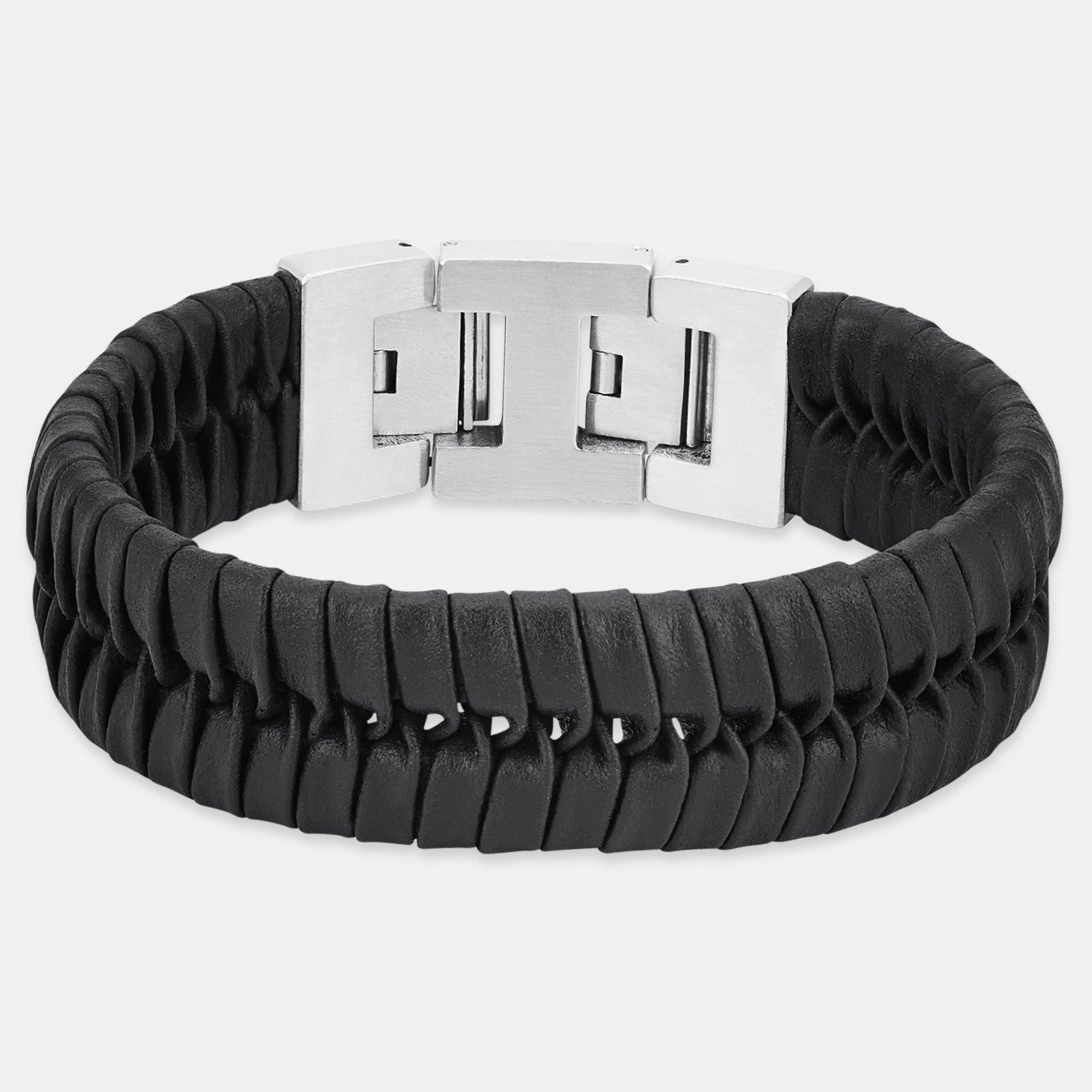 Das 19 mm breite Lederarmband von s. Oliver besteht aus schwarzem Rindsleder in Flechtoptik. Der praktische, verstellbare Clip-Verschluss passt die Länge des Armbandes zwischen 20 und 22 cm perfekt an.