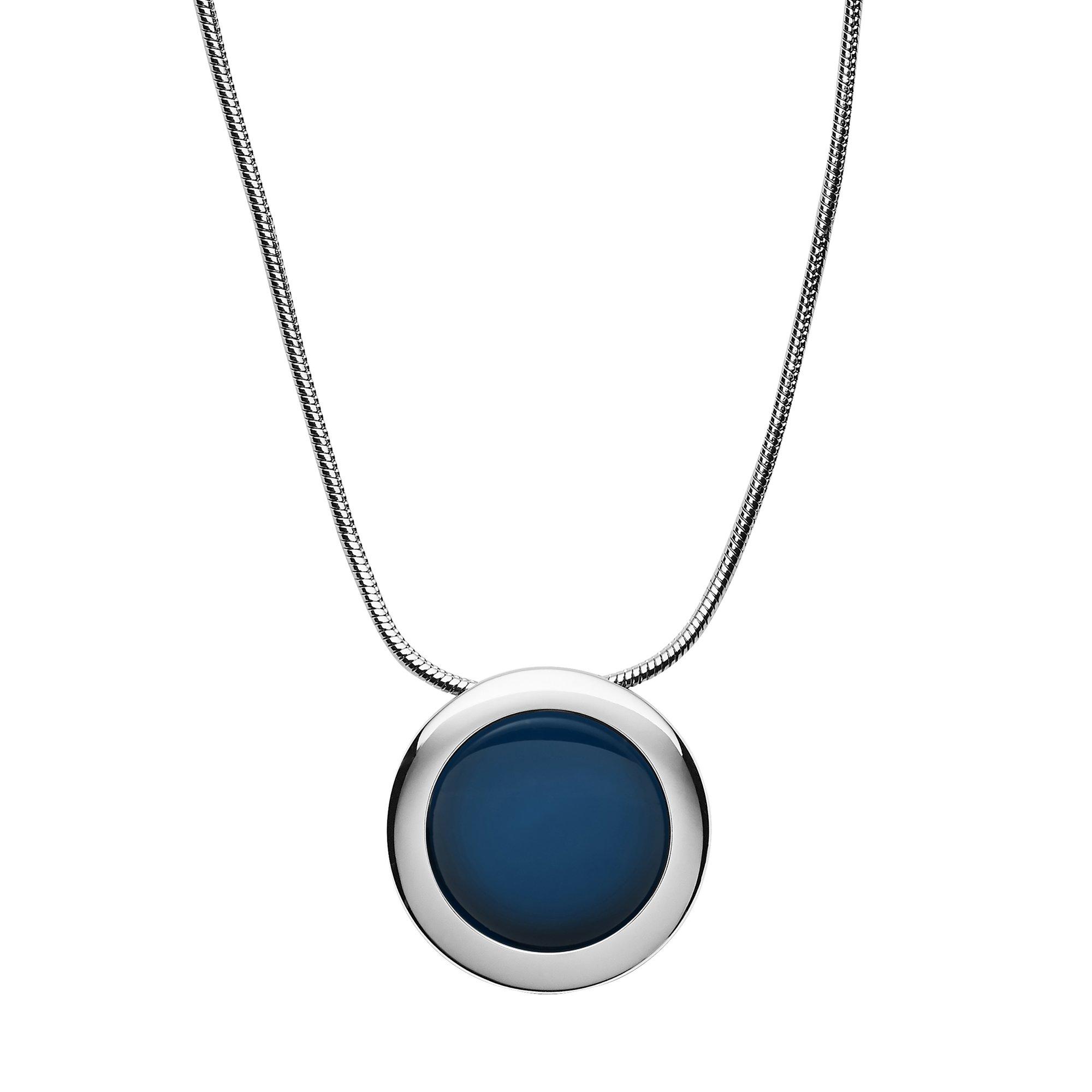 Diese Halskette hat einen runden Anhänger, der an vom Meer geschliffenes Glas erinnert. Eine 40 cm lange Milanaisekette hält den in polierten Edelstahl gefassten Glasstein.