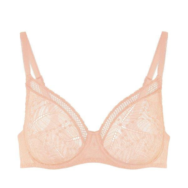 Dieser Bügel-BH ist aus geformter Spitze gefertigt und bietet sowohl Halt als auch eine zarte Ästhetik. Das Full-Cup-Modell ist ideal für eine natürlich aussehende Brust, während der tiefe Ausschnitt mit Klöppelspitze verziert ist.