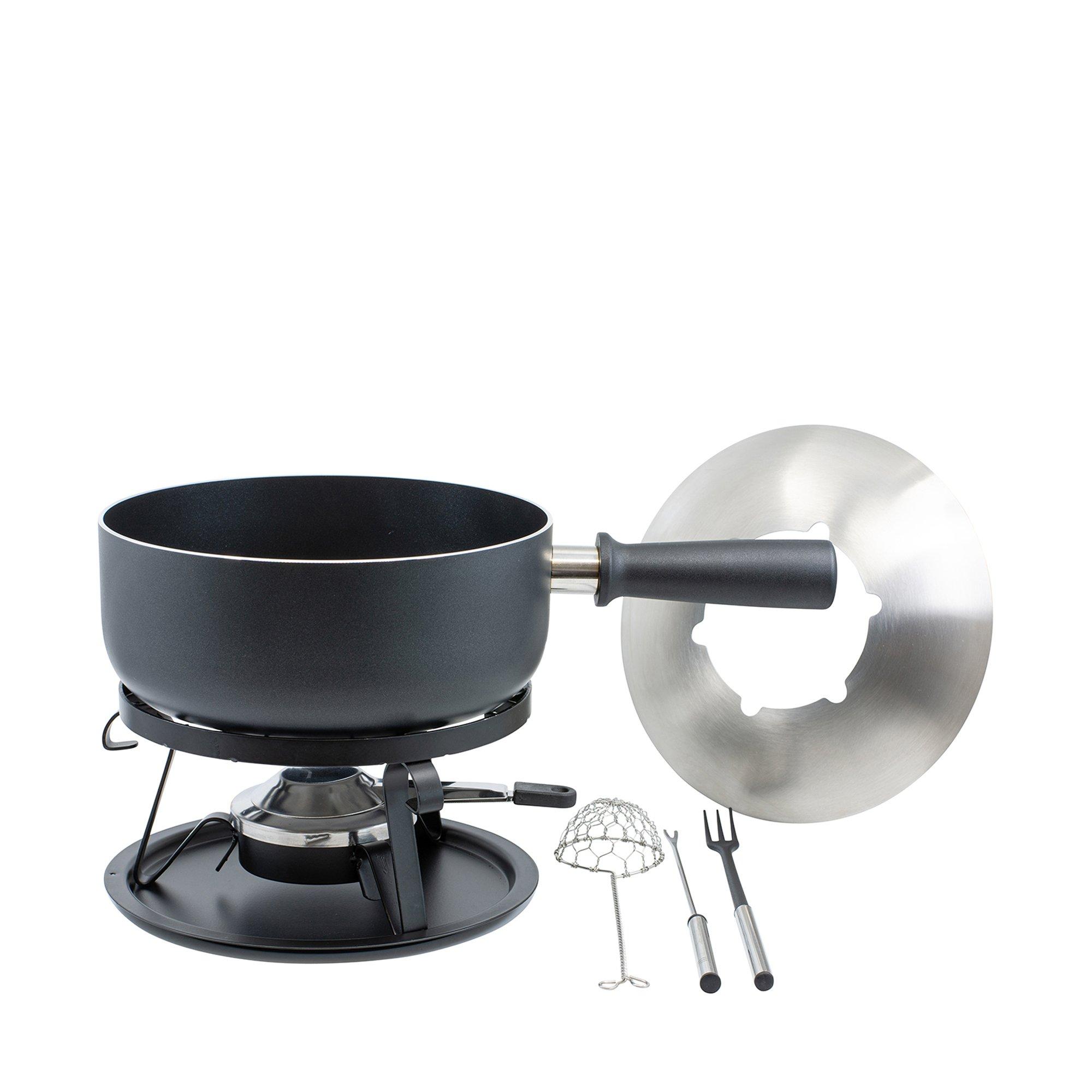 Das Multifunktionale Fondue-Set "Royal" von Kadastar beinhaltet die hochwertige Aluguss-Pfanne mit Antihaftbeschichtung. Dank des mitgelieferten Edelstahl-Spritzschutzes kann die Pfanne sowohl für Käsefondue, als auch für Fleischfondue verwendet werden. Die Pfanne besticht durch ihr elegantes Design mit poliertem Rand. Der Bakelitgriff mit Abrutschschutz liegt optimal in der Hand und leitet keine Wärme. Diese Pfanne verfügt über einen leistungsstarken Induktionsboden und ist somit für alle Herdarten geeignet. Die für das Käsefondue mitgelieferten Nylon Gabeln, schützen zusätzlich die Antihaftbeschichtung, was sich auf die Langlebigkeit auswirkt.