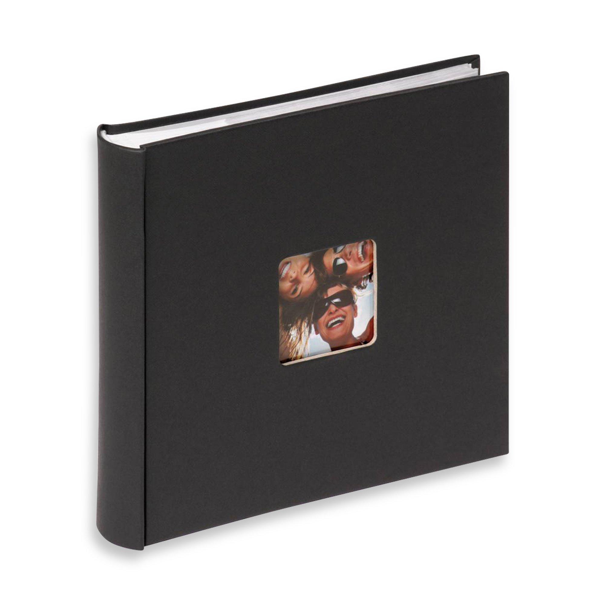Minialbum im Hardcover-Einband mit schwarzen Seiten mit hochwertigem Papiereinband und quadratischem Bildausschnitt 6x6 cm auf der Vorderseite für ein persönliches Fotos. Das Minialbum bietet Platz für 36 Fotos im Format 10x15 cm im Querformat.