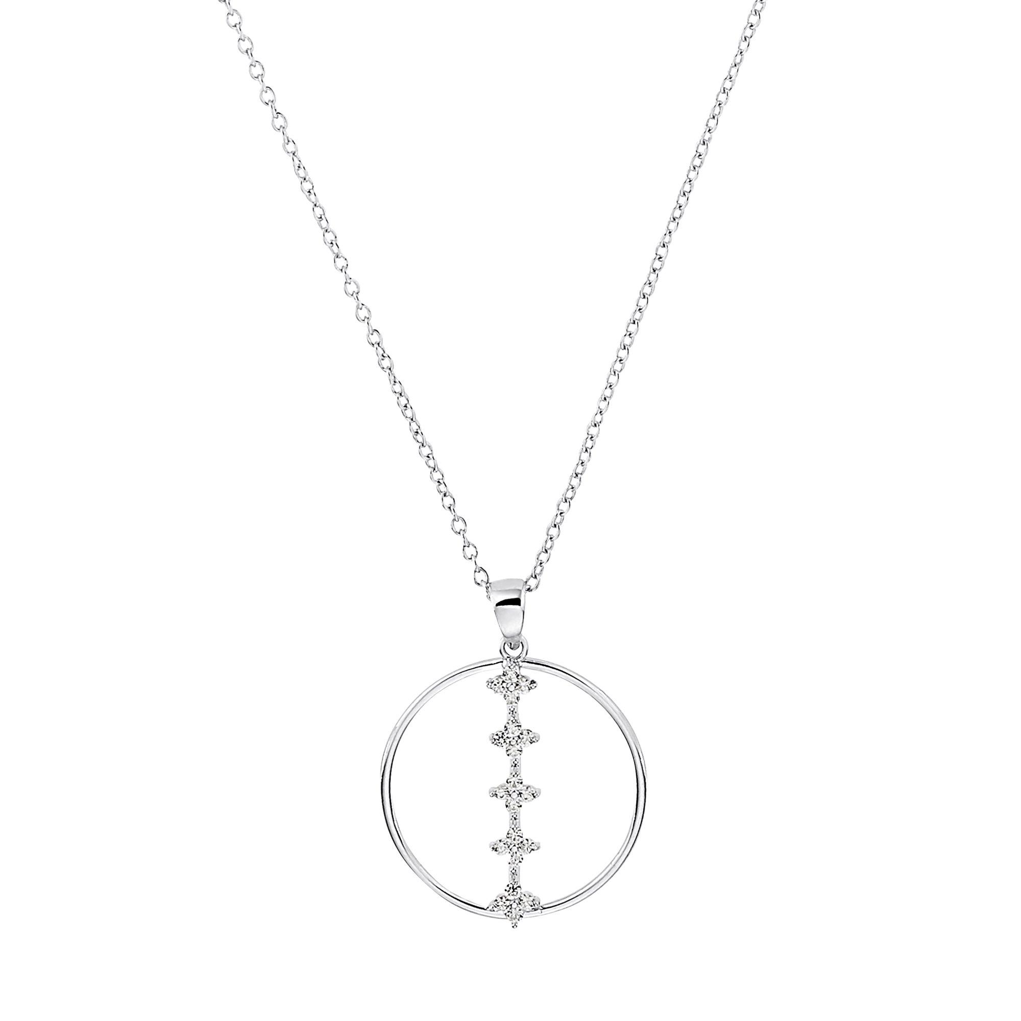Diese elegante Kette der Marke Amor ist aus hochwertigem 925er Sterling Silber gefertigt und mit einer Rhodiumschicht ummantelt für langanhaltende Qualität. Der Anhänger besteht aus einem Ring, welcher von einem senkrechten Stäbchen durchkreuzt wird, das mit funkelnden Zirkonia-Steinen veredelt ist.