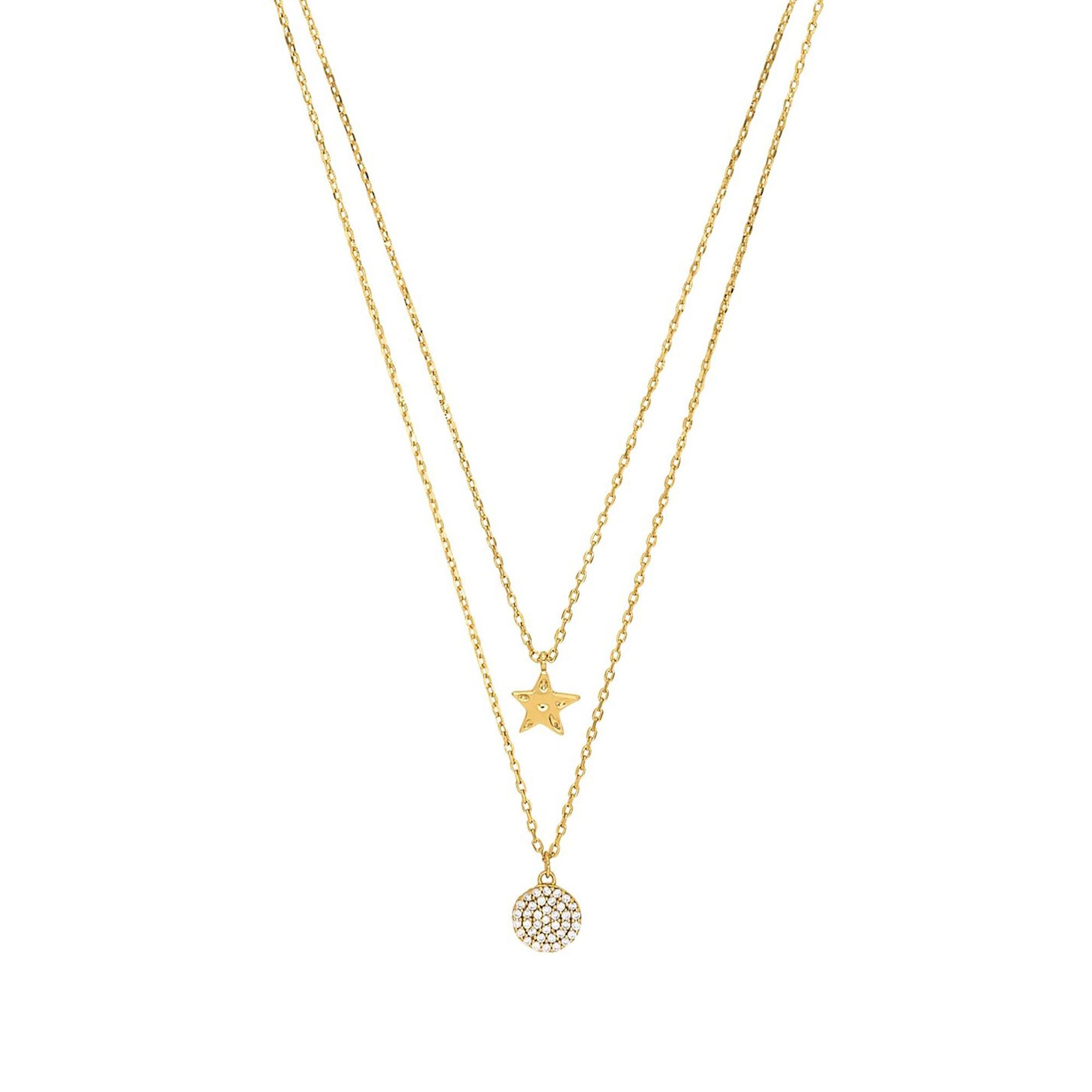 Diese modische Halskette der Marke Amor im Layering Look besteht aus zwei unterschiedlich langen Anker-Ketten mit je einem Anhänger. Einer davon ist ein Stern aus golden glänzendem Sterling Silber und der andere ist kreisrund und mit zahlreichen Zirkonia-Glitzersteien veredelt. Ein charmant-verspielter Begleiter für den Alltag!
