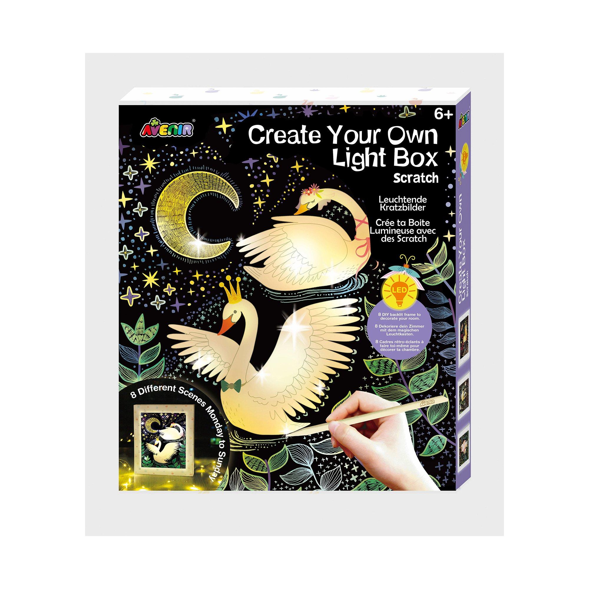 Mit dem Bastelset von Avenir lassen sich schöne, handgestaltete Leuchtkasten kreieren. Es hat acht verschiedene Designs zur Auswahl, die zu tollen, leuchtendn Kratzbildern gestaltet werden können. Die Schachtel wir zum Rahmen und das Set beinhaltet ausserdem eine Lichterkette für die Hintergrundbeleuchtung.