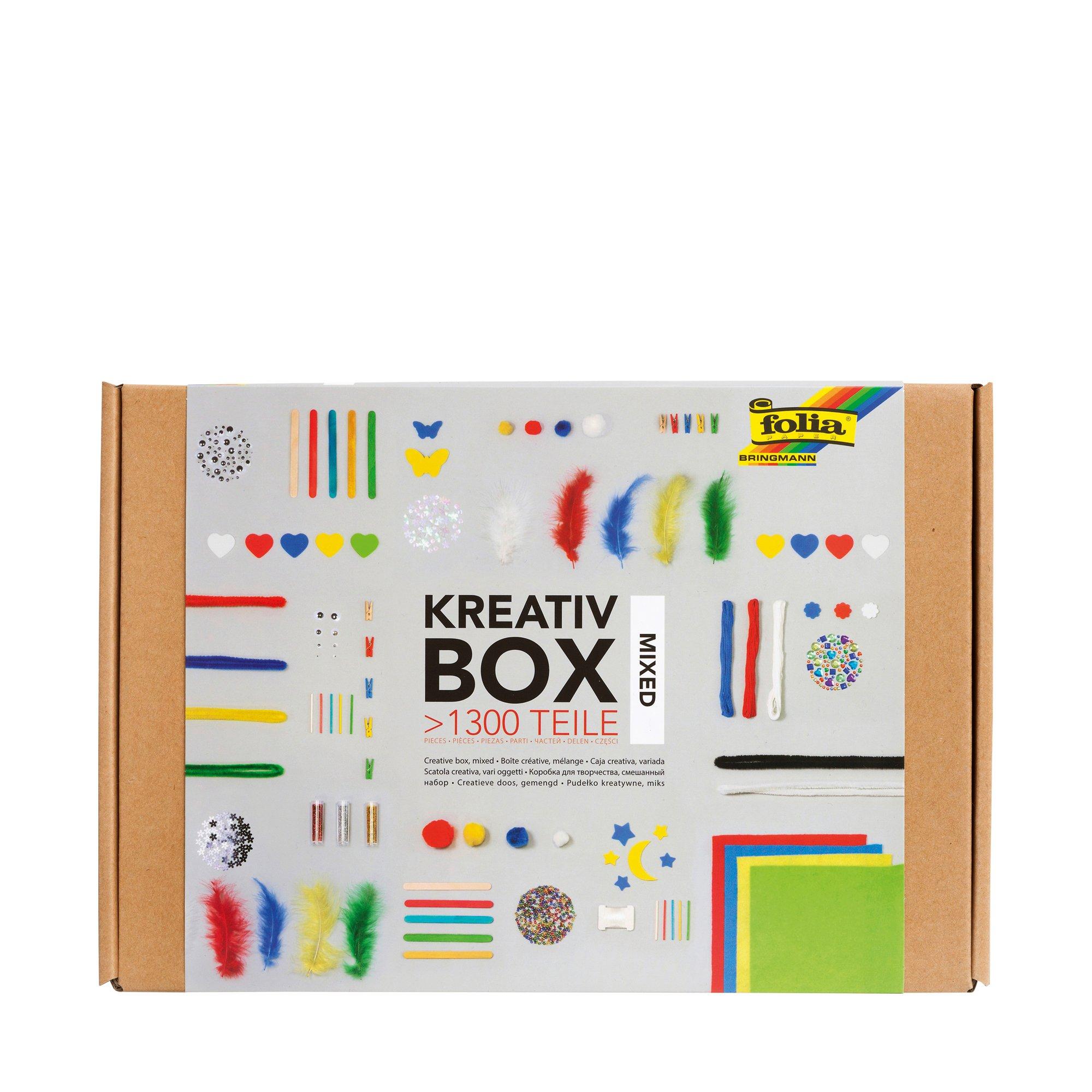 Inhalt: 100 Wackelaugen, 4x Bastelfilz 150g/qm 20x30cm farbig sortiert, 150 Moosgummistanzteile, 200 Schmucksteine, 10 Chenilledrähte, 20 Pompons, 30 Holzklammern, 200 Bastelhölzer, 30 Holzstäbchen, 400 Perlen, 200 Pailetten, 20 Flauschfedern, 3 Stickgarn à 8m, 3x Glitterpulver, 1 Nylonfaden 0,2mmx10m, verpackt in einem farbig bedruckten Karton mit Inhaltsfächer, in diesem Set sind über 1300 Teile enthalten.