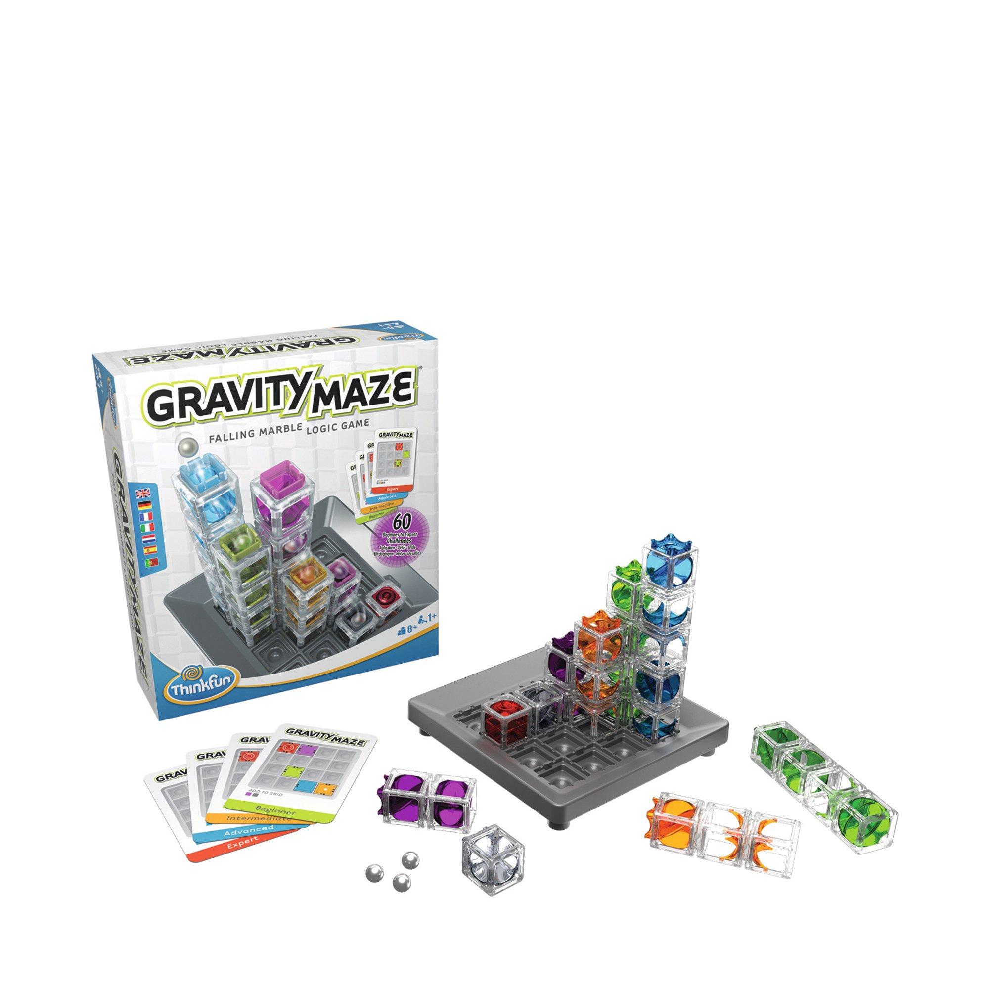 Gravity Maze stellt die Vorstellungskraft und das logische Denken des Spielers auf die Probe. Wer kann die transparenten Türme so geschickt auf dem Spielbrett miteinander kombinieren, dass die Metallkugel durch alle Turmteile hindurchrollt und im roten Zielturm landet? Eine wahre Herausforderung, denn die verschieden hohen Türme haben in ihrem Inneren Löcher, Schrägen, aber auch ebene Flächen. Nur, wenn der Spieler alle Türme richtig miteinander kombiniert, entsteht ein ununterbrochener Weg für die Kugel durch das Labyrinth.