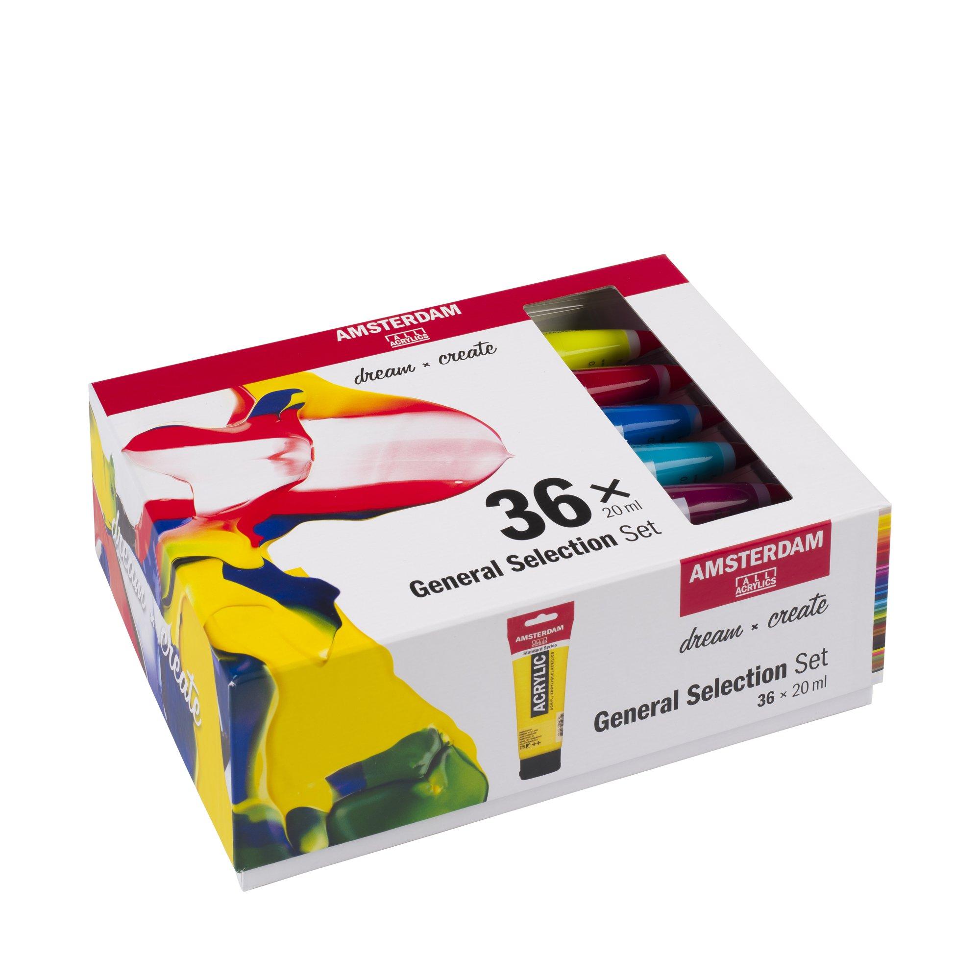 Dieses Set enthält eine ausgewogene Farbpalette und verschiedene Deckgrade. Die 36x20 ml Tuben aus der Amsterdam Acryl Standard Series sind aus hochwertigen Pigmenten und einer 100 %igen Acrylemulsion hergestellt. Diese Farbe von mittlerer Viskosität erzielt deutliche Pinselstriche und Textur, Sie können damit aber auch große Flächen mit einer gleichmässigen Farbe bedecken.