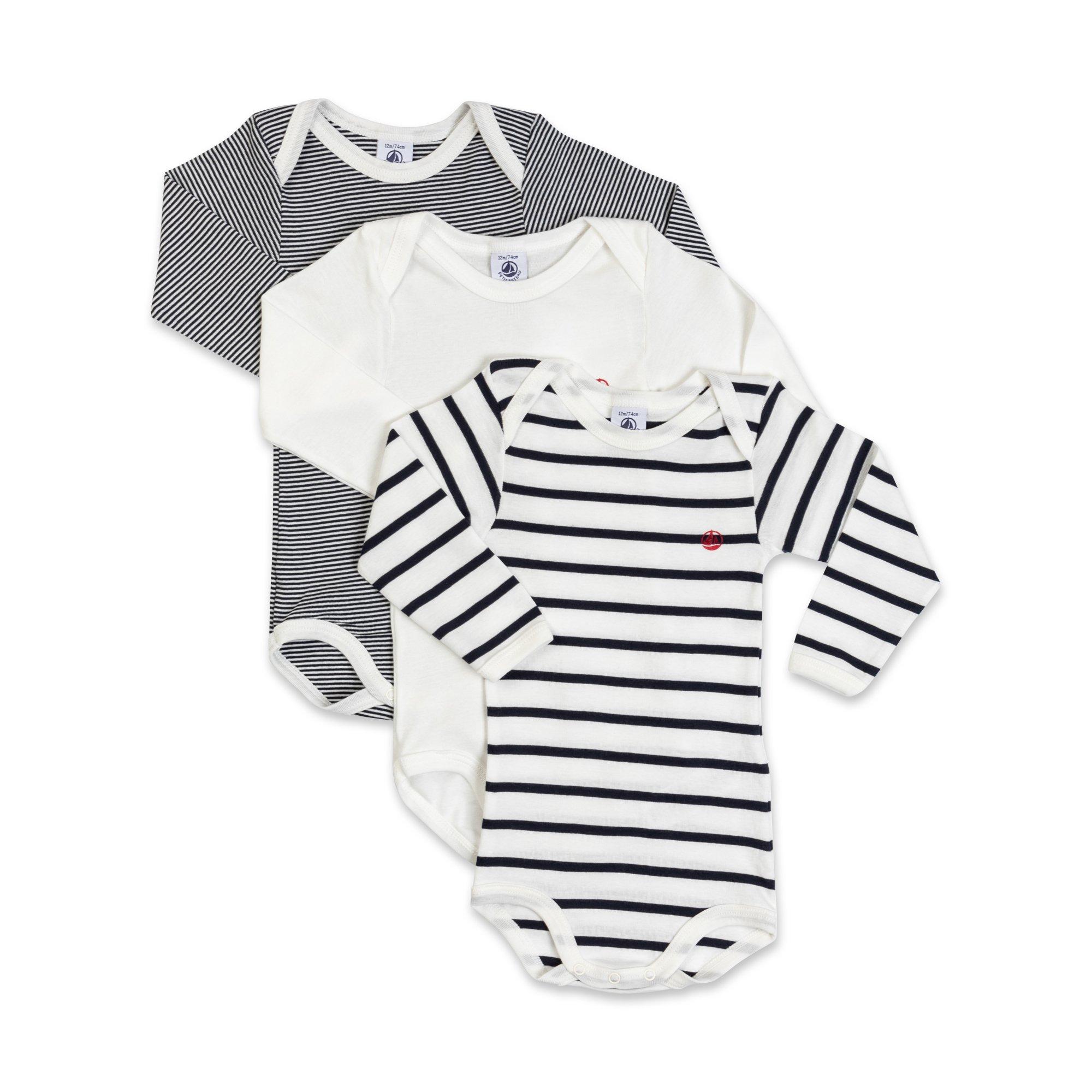 Dieses Set mit drei langärmeligen Neugeborenen-Bodys besteht aus Rippstrick, dem ikonischen Material von Petit Bateau. Das Modell ist ein Oeko-Tex Standard 100 zertifiziertes Produkt, das die Hautverträglichkeit gewährleistet.