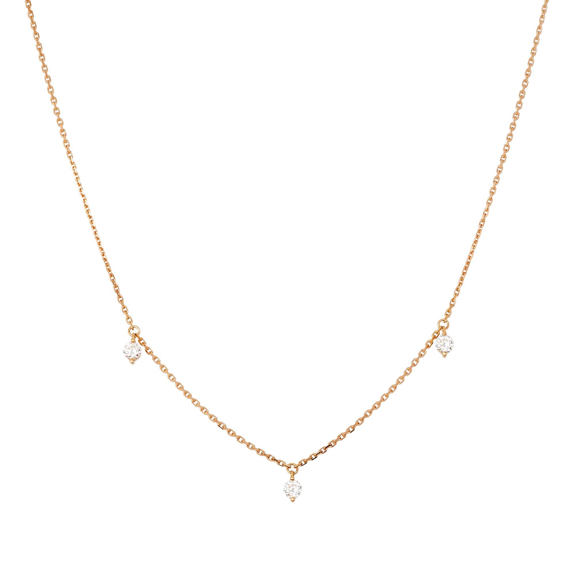 Diese elegante Halskette der Marke ZEN DIAMOND ist aus wundervollem 18-karätigen Roségold gefertigt. Sie besteht aus einer hauchzarten Ankerkette welche mit drei funkelnden 0,26-karätigen Diamanten in Chatonfassung verziert ist.