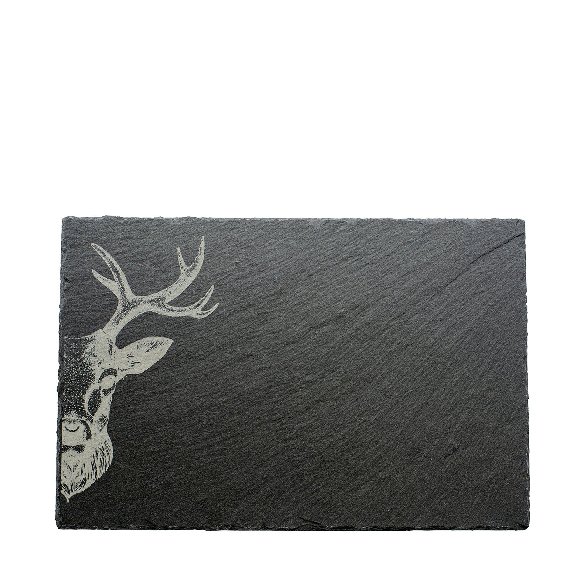 Diese Schieferplatte ist vielseitig einsetzbar. Perfekt zum Anrichten und Servieren von Fingerfood, ebenso als Topfuntersetzer oder als schickes Platzset stets ein Hingucker. Hirsch-Motiv mit Liebe in der Schweiz auf den hauseigenen Maschinen graviert. Von Kadastar.