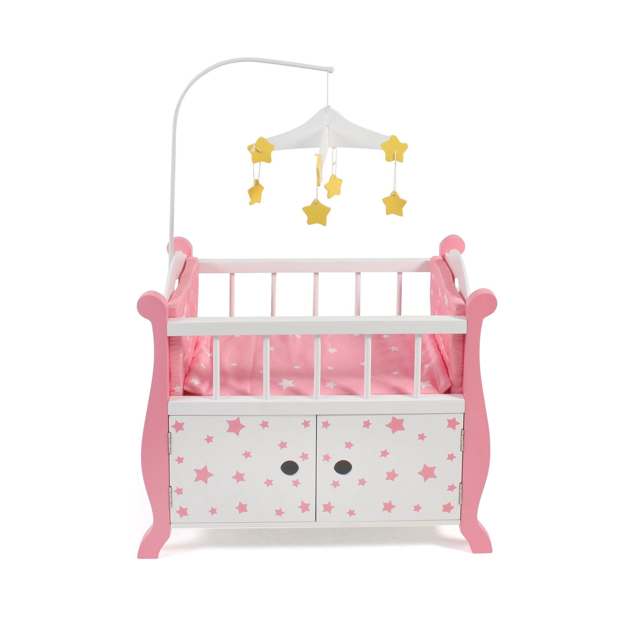 Dieses wunderschöne Puppenbett eignet sich für alle Puppen bis ca. 46 cm und bietet einen entspannenden Schlafplatz nach einem anstrengenden Spieltag. Besonders niedlich ist das Mobile, das über dem Bett hängt. Die Seiten sind weich gepolstert, so dass es die Puppe sehr bequem hat. Die beiden Schranktüren vorne können geöffnet werden und bieten viel Stauraum für Accessoires. Hergestellt aus umweltfreundlichen MDF. Artikelmaße: 57 x 31 x 78 cm / Gewicht: 4,9 kg