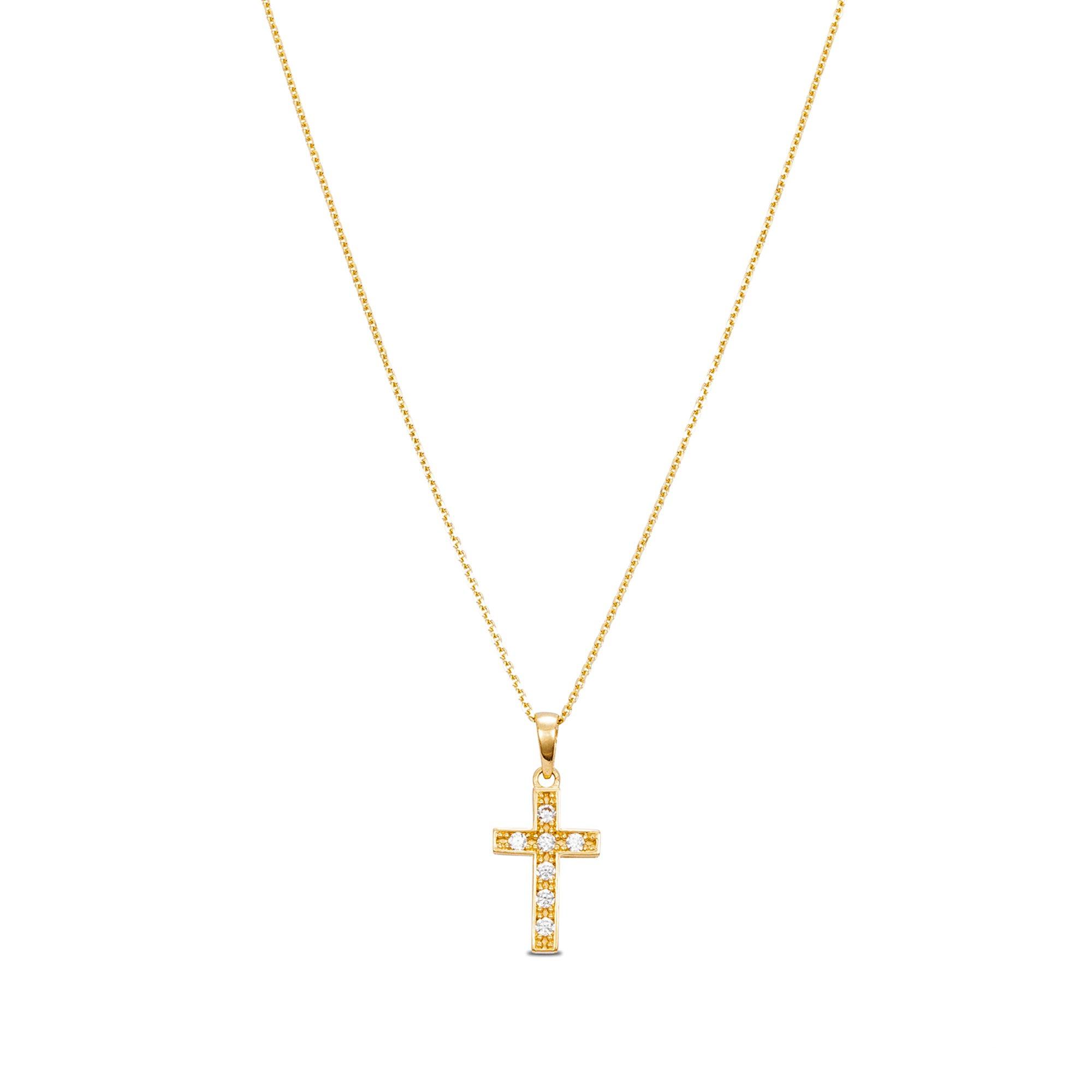 Diese elegante Halskette der Marke L'Atelier Gold 18 Karat by Manor ist filigran gefertigt. Sie kommt in Form einer zarten Ankerkette und einem Kreuzanhänger mit Zirkoniabesatz daher.