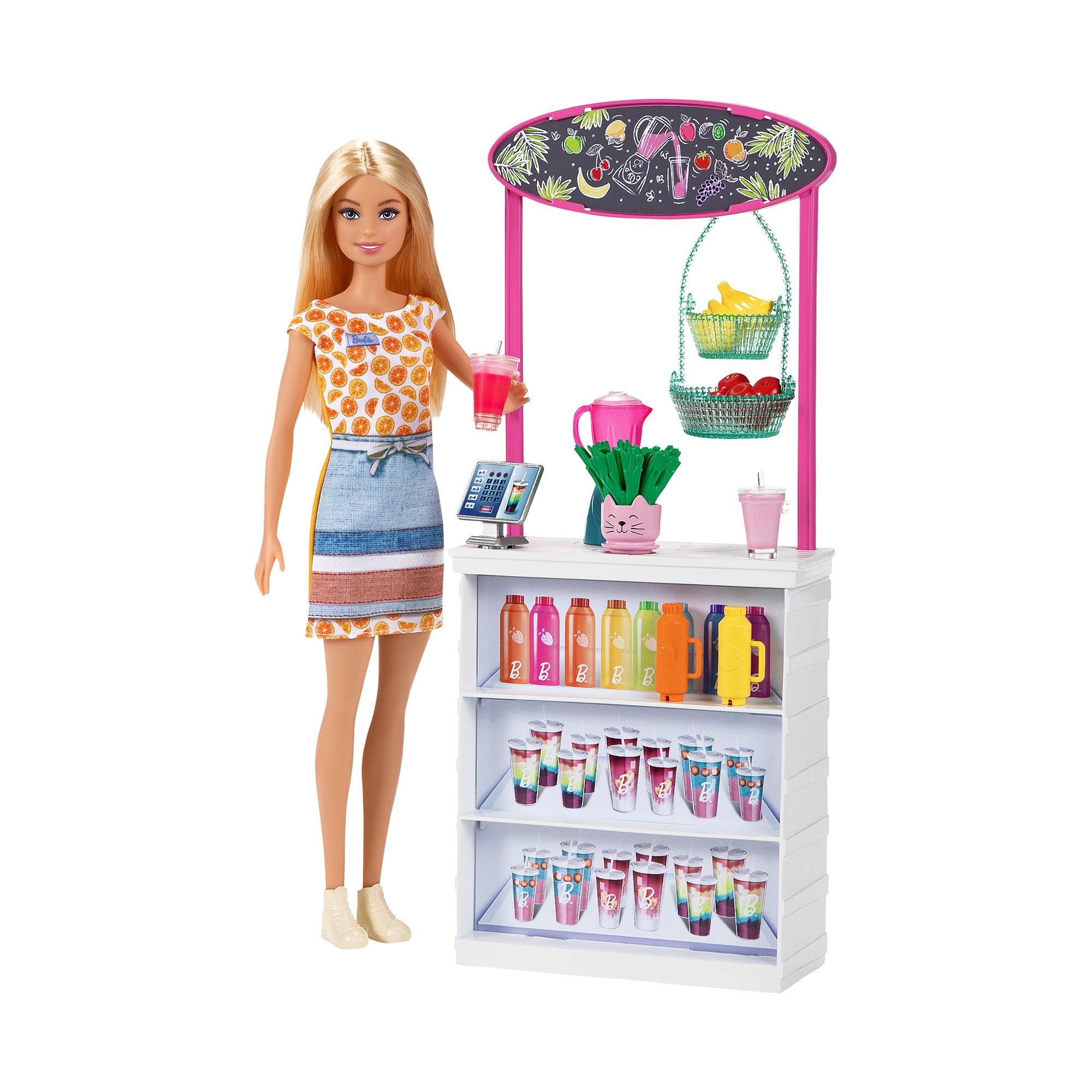 Zeit für ein paar leckere Smoothies für Barbies Kunden mit dem Wellness Smoothie Bar Spielset! Diese Barbie (30,4cm) trägt ein süßes Kleid mit Fruchtmuster und passender Schürze. Sie hat alles, um leckere Smoothies für ihre Kunden zuzubereiten: Früchte, Gemüse und sogar Weizengras in einem Blumentopf im Katzendesign! Kinder lieben es, Barbie mit Zubehörteilen wie Mixer, Fruchtimitaten und Bechern beim Zubereiten ihrer Smoothies zu helfen. Wenn alles trinkfertig“ ist, werden die Smoothies in den beiden Bechern mit abnehmbaren Deckeln und Farbwechseleffekt serviert. Die Becher färben sich pink, wenn sie mit kaltem Wasser gefüllt werden. Mit warmem Wasser nehmen sie wieder ihre ursprüngliche Farbe an. So kann das Spiel immer wieder wiederholt werden. Wenn die Smoothies fertig sind, kann Barbie die Bestellungen über die Kasse aufrufen. Kinder haben mit diesem Spielset unendlich viele Möglichkeiten, um kreative, fantasievolle Geschichten nachzuspielen. Enthält eine Barbie Puppe mit Smoothie-Bar und 10 Zubehörteilen. 2 Becher mit Farbwechseleffekt und abnehmbaren Bechern, 2 Flaschen, 2 Obstbündel, Obstkorbhalter, Mixer, Kasse und Weizengras in einem Blumentopf mit Katzendesign. Die Puppe kann nicht von allein stehen. Abweichungen in Farbe und Gestaltung. Das perfekte Geschenk für Kinder im Alter von 3 bis 7 Jahren!