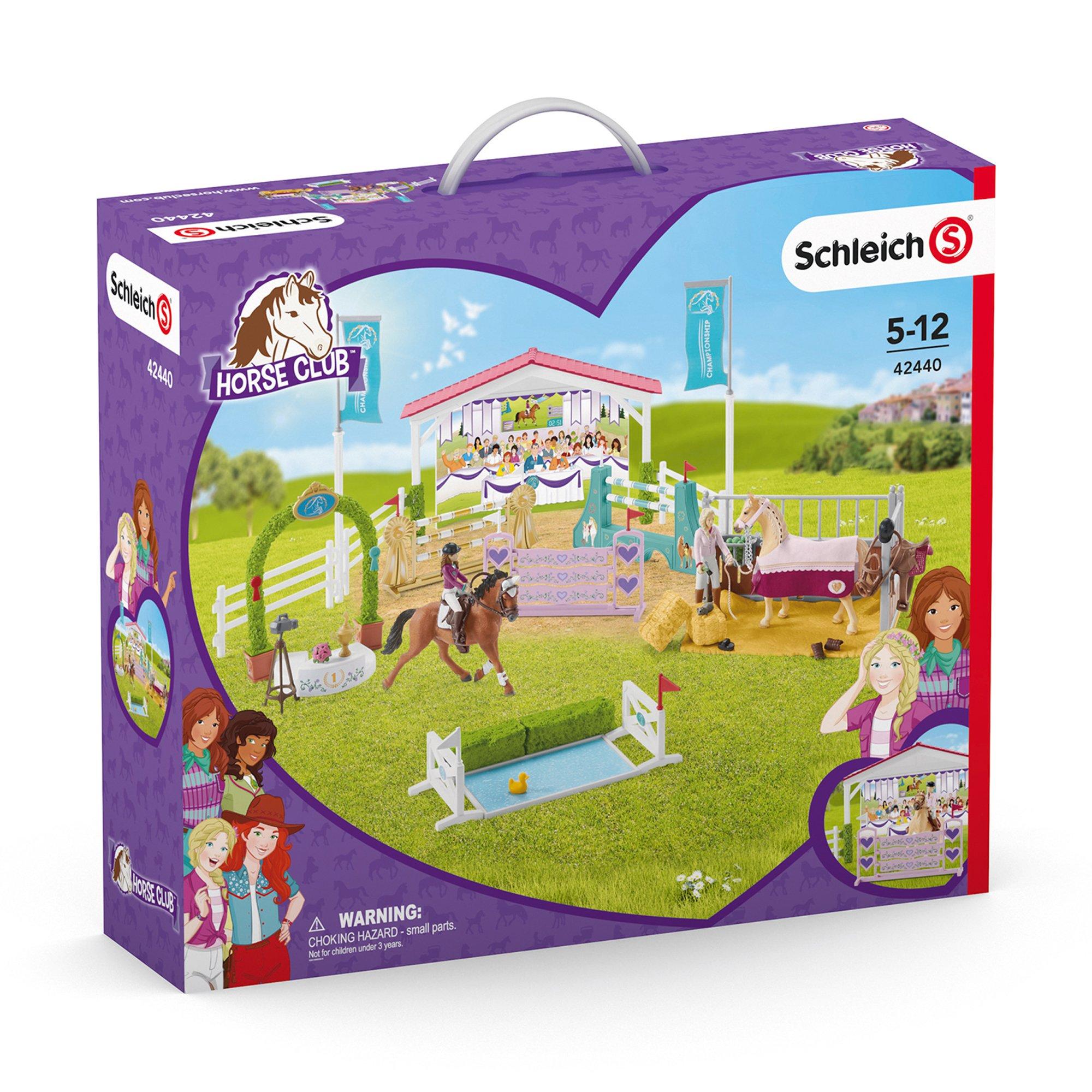 Beim Freundschaftsturnier von Schleich® Horse Club reiten Sofia und Lisa eine Araber- und eine Trakehner-Stute. Die vielfältigen Spielfunktionen und das umfangreiche Zubehör sorgen für großartigen Spielspaß: Die voll beweglichen Mädchenfiguren machen die Tiere in der Pferdebox mit Kardätsche und Hufkratzer sauber und legen ihnen Sattel und Zaumzeug an. Bevor sie losreiten, setzen sie noch ihre Helme auf. Der Parcours ist mit Zäunen umgeben und führt über zwei Steilsprünge. Einer ist mit Herzen verziert und der andere mit goldener Farbe bemalt. Beim gefürchteten Wassergraben ist Konzentration gefragt. Zwei Fahnen flattern im Wind, und plötzlich flitzt eine Maus hinter die Strohballen! Die Zuschauer auf der Tribüne sind aufgeregt vor Spannung. Lassen sich die Pferde verunsichern? Nach dem Turnier werden auf dem Siegerehrungspodium ein Blumenstrauß und Siegerschleifen übergeben. Mit Kamera und Stativ werden tolle Erinnerungsfotos gemacht.