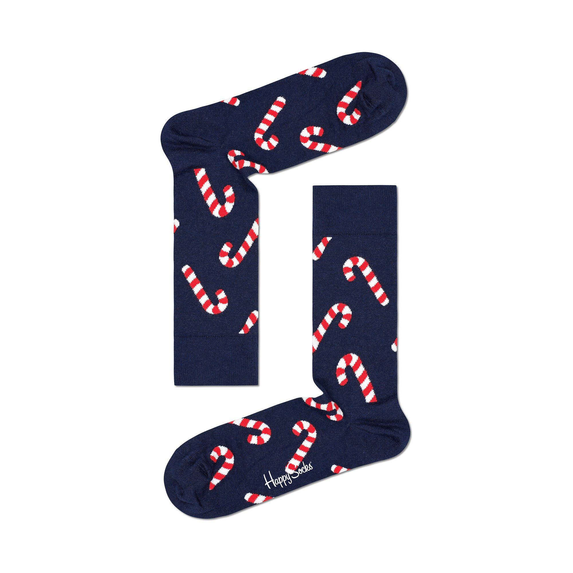 Diese Socken verfügen über ein verspieltes Zuckerstangenmuster, das jedem Outfit eine festliche Note verleiht. Das Design ist auf einem dunkelblauen Hintergrund verteilt, wodurch die rot-weissen Zuckerstangen hervorstechen.