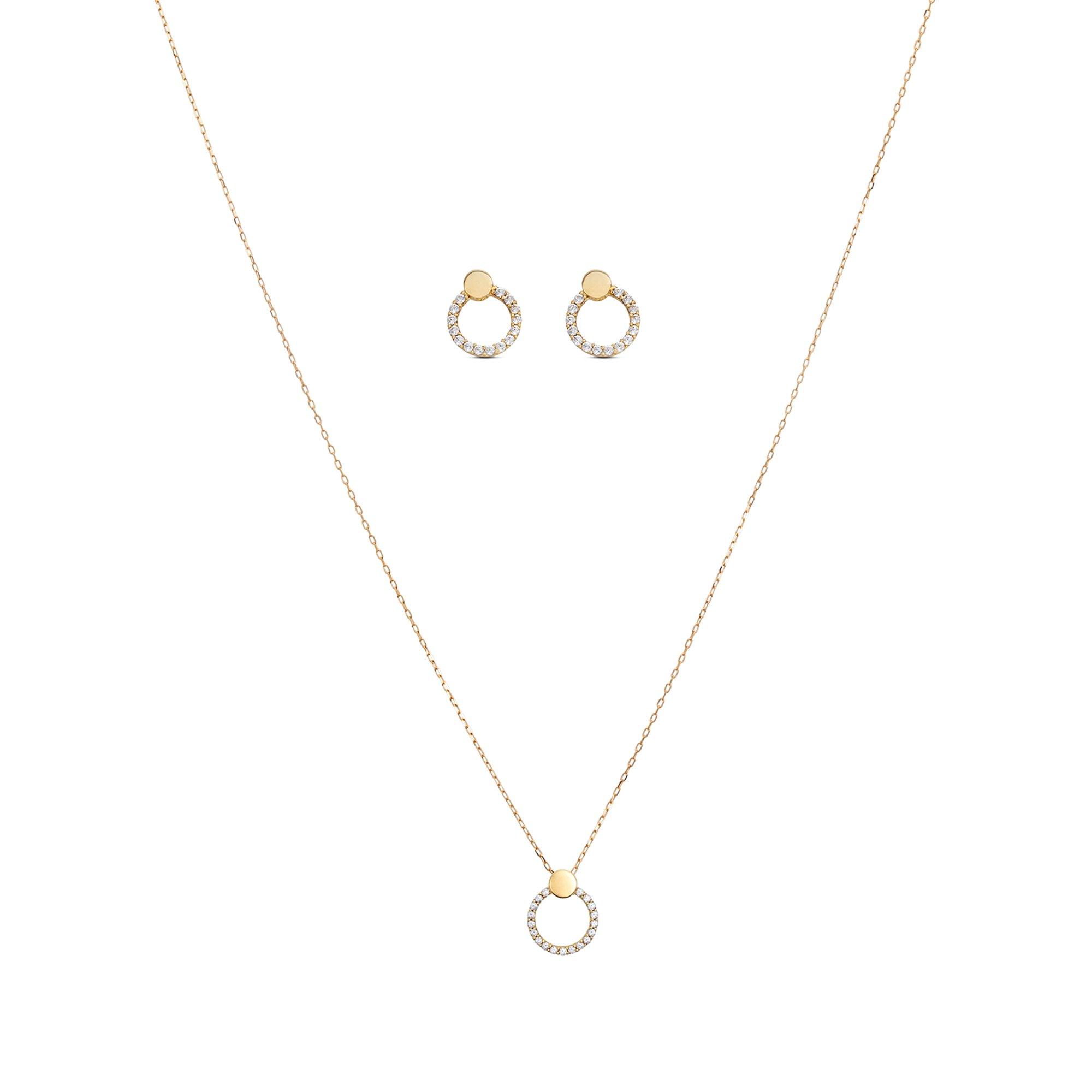 Das wundervolle Schmuck-Set von L'Atelier Gold 18 Karat by Manor besteht aus zwei zierlichen Ohrsteckern mit funkelndem Zirkonia-Besatz und einer eleganten Halskette im selben Design an einer feinen Ankerkette aus hochwertigem Gelbgold.