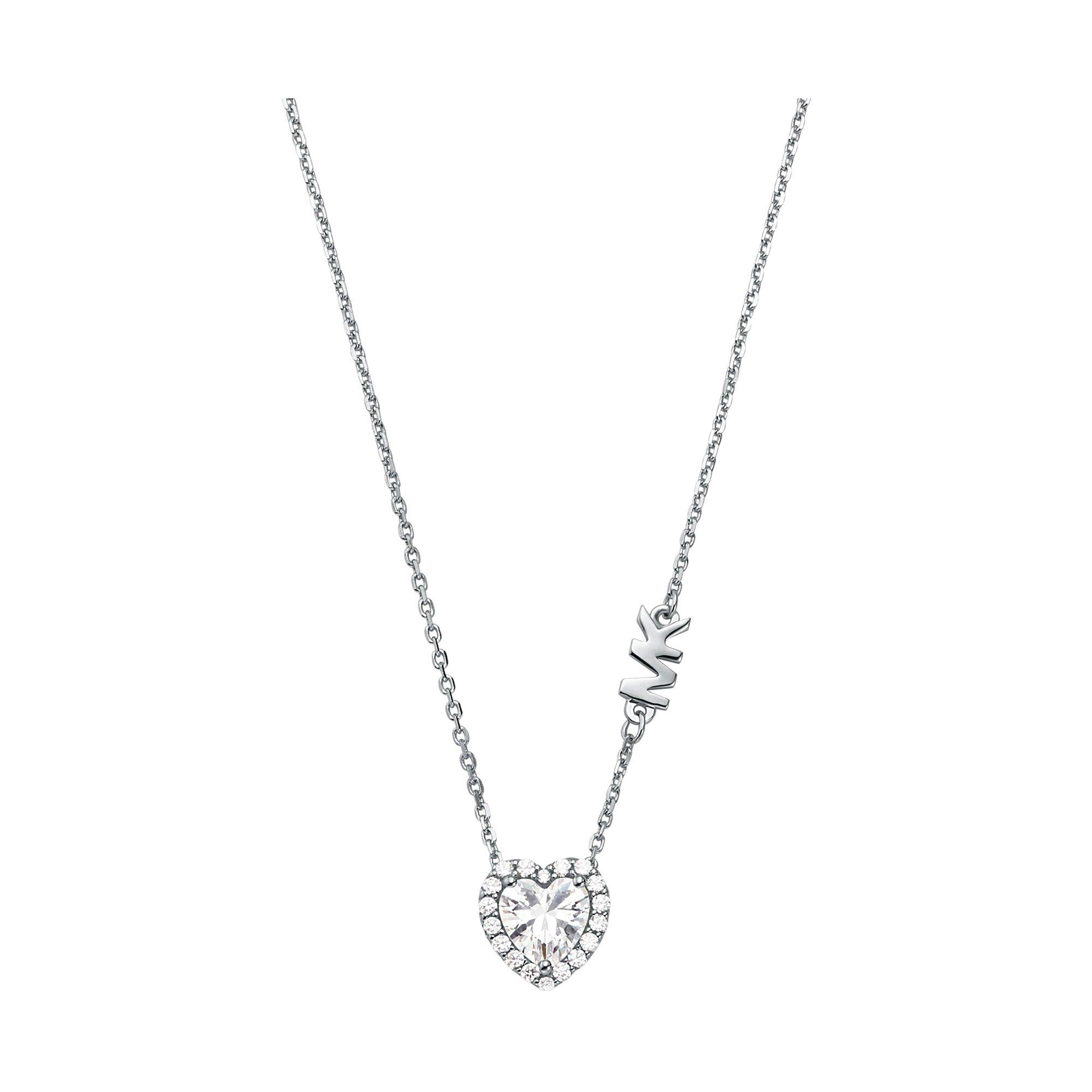 Diese zierliche Halskette der Marke MICHAEL KORS besteht aus hochwertigem Sterlingsilber. Das bezaubernde Schmuckstück kommt mit einem herzförmigen Anhänger, welcher mit Zirkonia-Steinen besetzt ist. Das MK Logo präsentiert sich mit einem zusätzlichen Anhänger auf der Seite.
