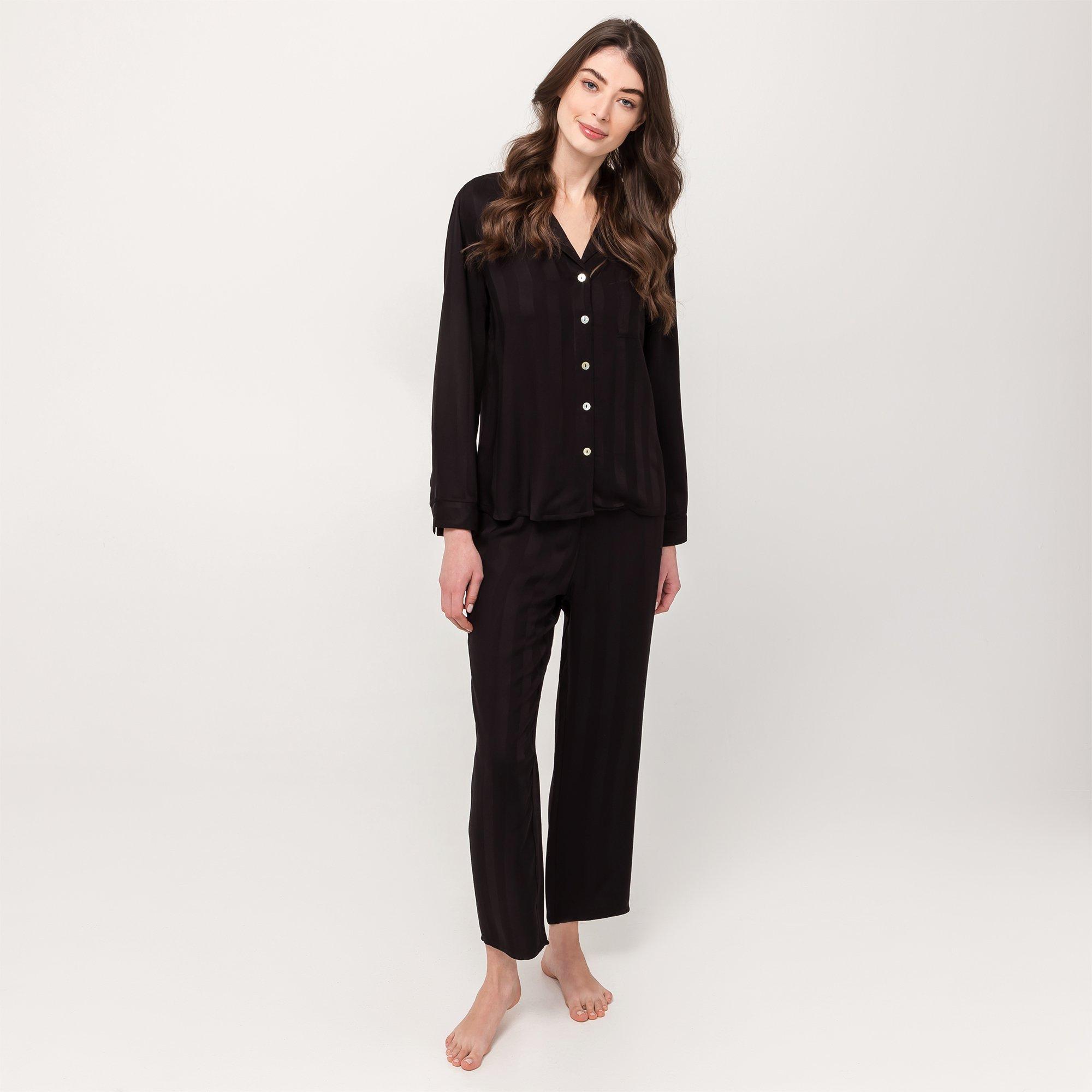 Dieses langärmlige Pyjama-Oberteil bietet Komfort und Stil für entspannte Abende. Es verfügt über einen klassischen Reverskragen und eine durchgehende Knopfleiste, was es zu einer vielseitigen Ergänzung jeder Nachtwäsche-Kollektion macht. Das Streifendesign verleiht einen Hauch von Eleganz.