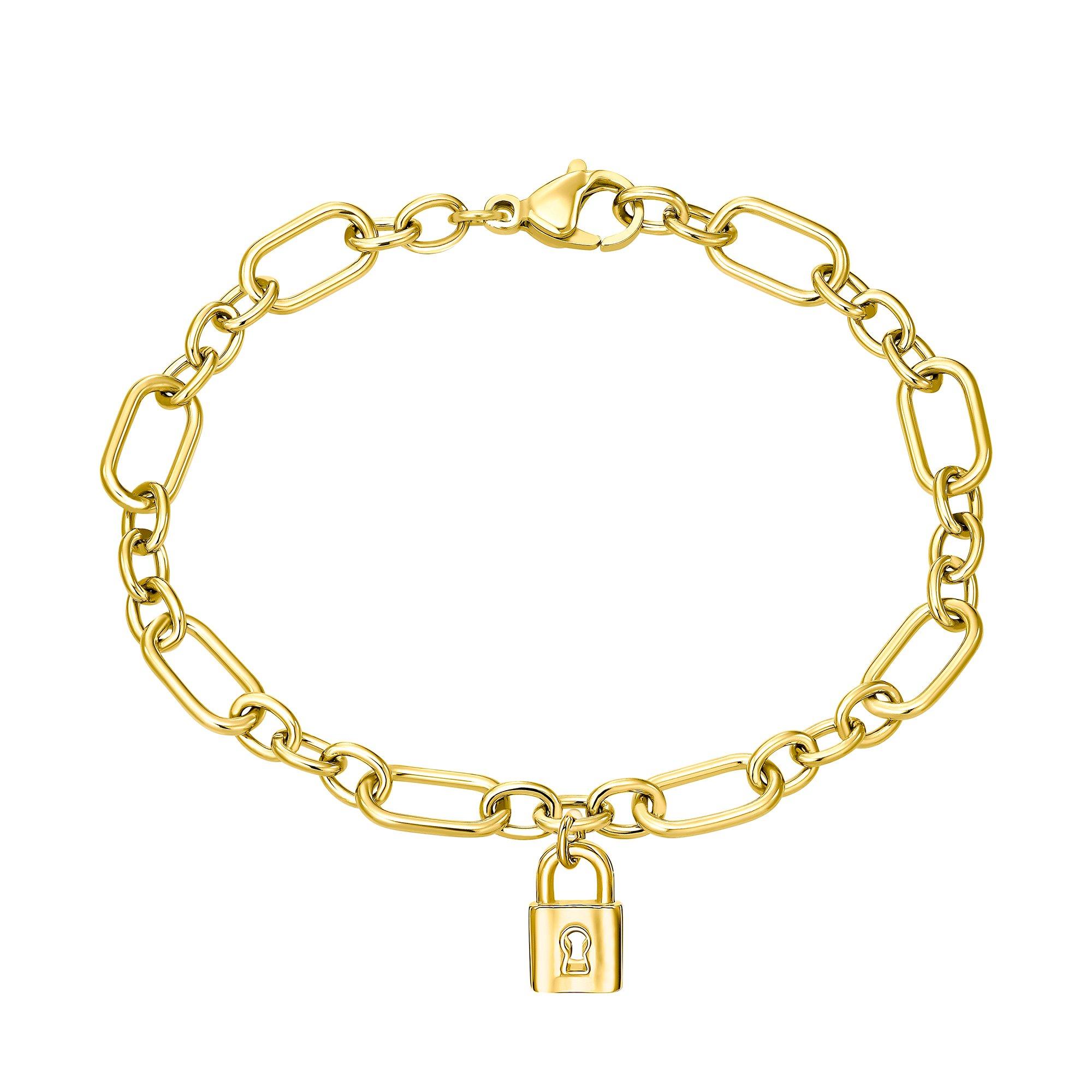 "Lock me up" – mit dieser romantisch modernen Armkette von s.Oliver setzt du ganz neue Akzente in deinem Look. Der Anhänger in Form eines Schloss macht den Armschmuck zu einem richtigen Eyecatcher und somit zum perfekten Begleiter für Alltag oder Party. Das Schmuckstück besteht aus hochwertigem Edelstahl und ist IP vergoldet. Kombiniere das Armband mit der passenden Halskette oder nutze es als Geschenk für die Freundin oder den Freund.