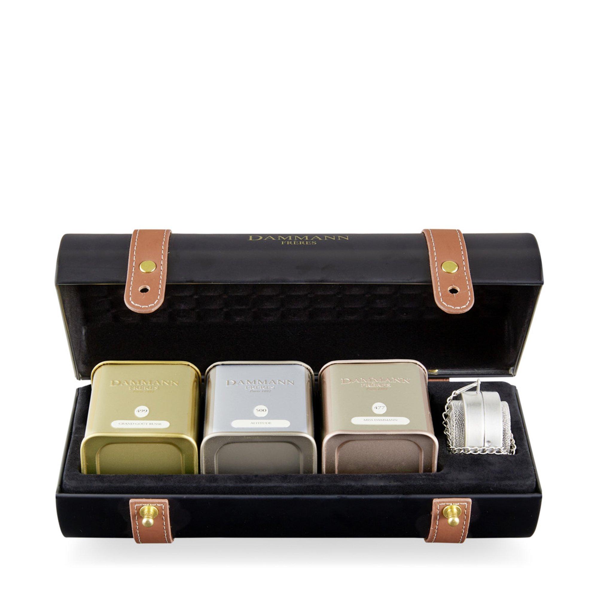 Eine klassische Mischung und zwei aromatisierte Tees, die in einer zylindrischen Schachtel neben einer Aufgusskugel untergebracht sind.