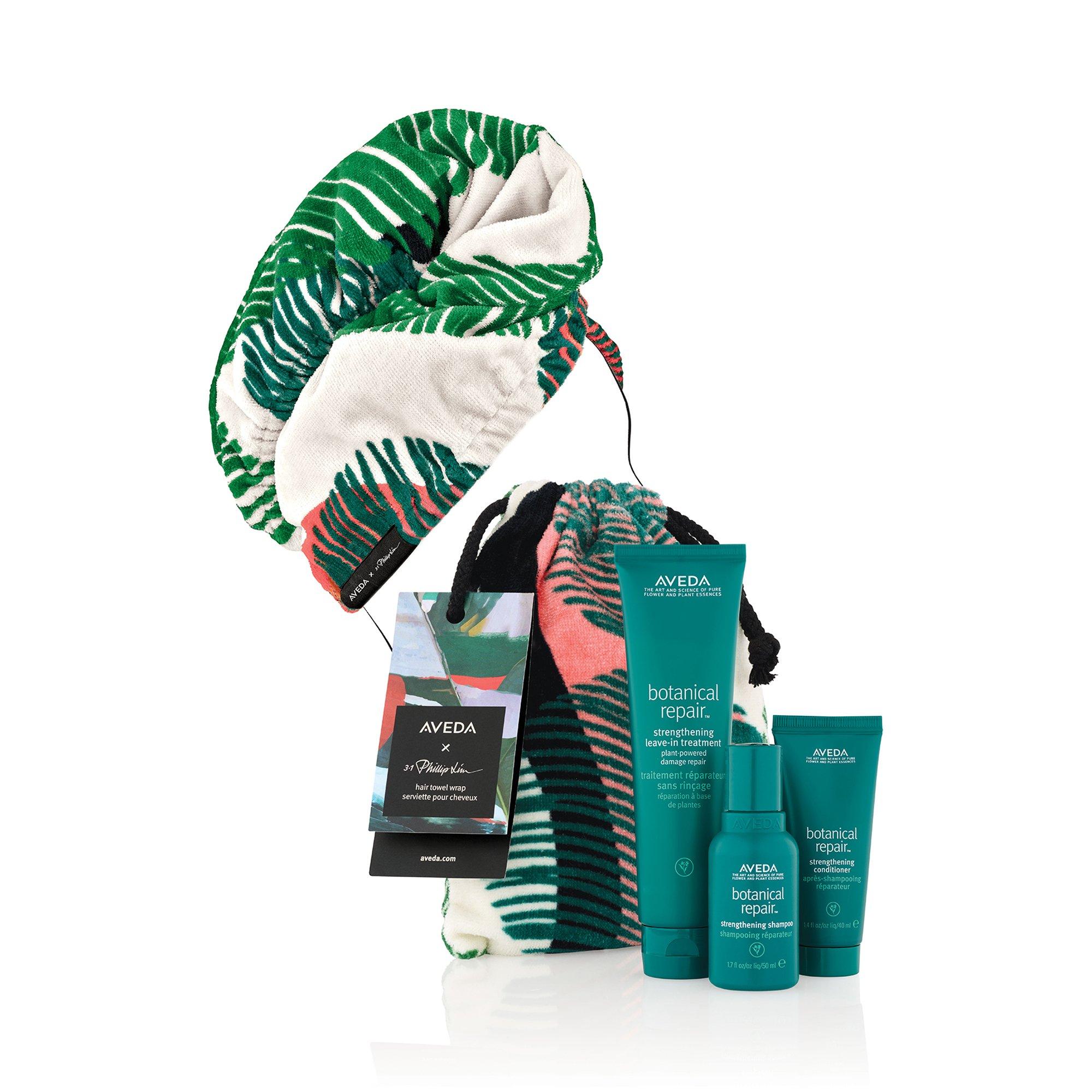 Schenken Sie wundersame Stärke. Verwandelnde Haarpflege mit Pflanzen-Power. Das Set enthält Botanical Repair TM Strengthening Shampoo 50 ml/1,7 fl. oz., Botanical RepairTM Strengthening Conditioner 50 ml/1,7 fl. oz., Botanical RepairTM Strengthening Leave-in Treatment 100 ml/3,4 fl. oz. und ein Limited-Edition Aveda x 3.1 Phillip Lim Hair Towel Wrap.