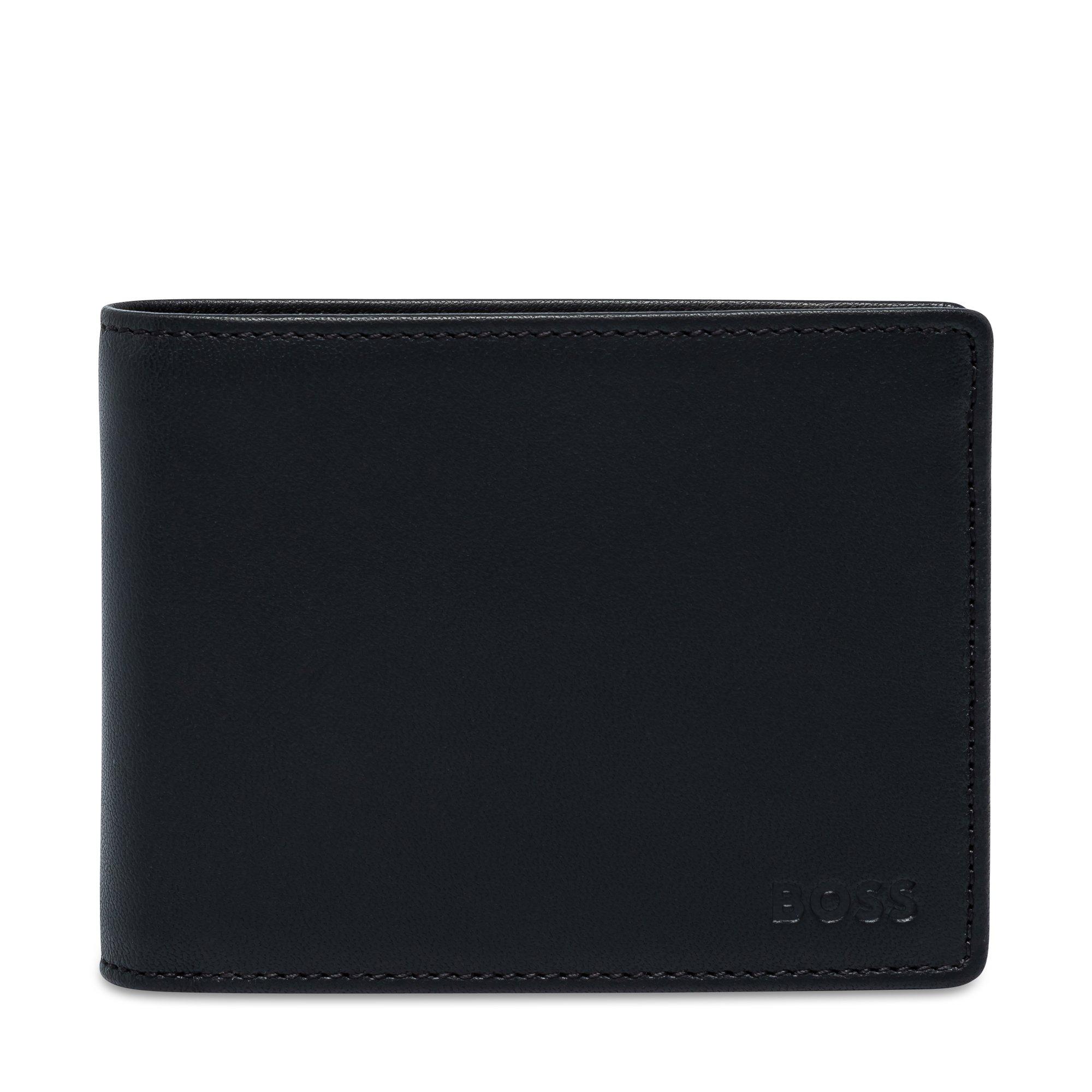 Das klassische Klapp-Portemonnaie von BOSS aus Leder hat eine elegante Logo-Prägung vorne. Es ist ausgestattet mit zwei Notenfächern, sowie einem Münzfach mit Druckknopf und acht Kartenfächern.