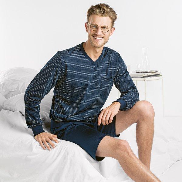 Dieses Langarm-T-Shirt verfügt über einen klassischen V-Ausschnitt und ein dezentes Punktmuster, das eine bequeme und stilvolle Option für Loungewear oder Freizeitkleidung bietet. Das Design umfasst eine praktische Brusttasche, die dem entspannten Schnitt einen Hauch von Funktionalität verleiht.