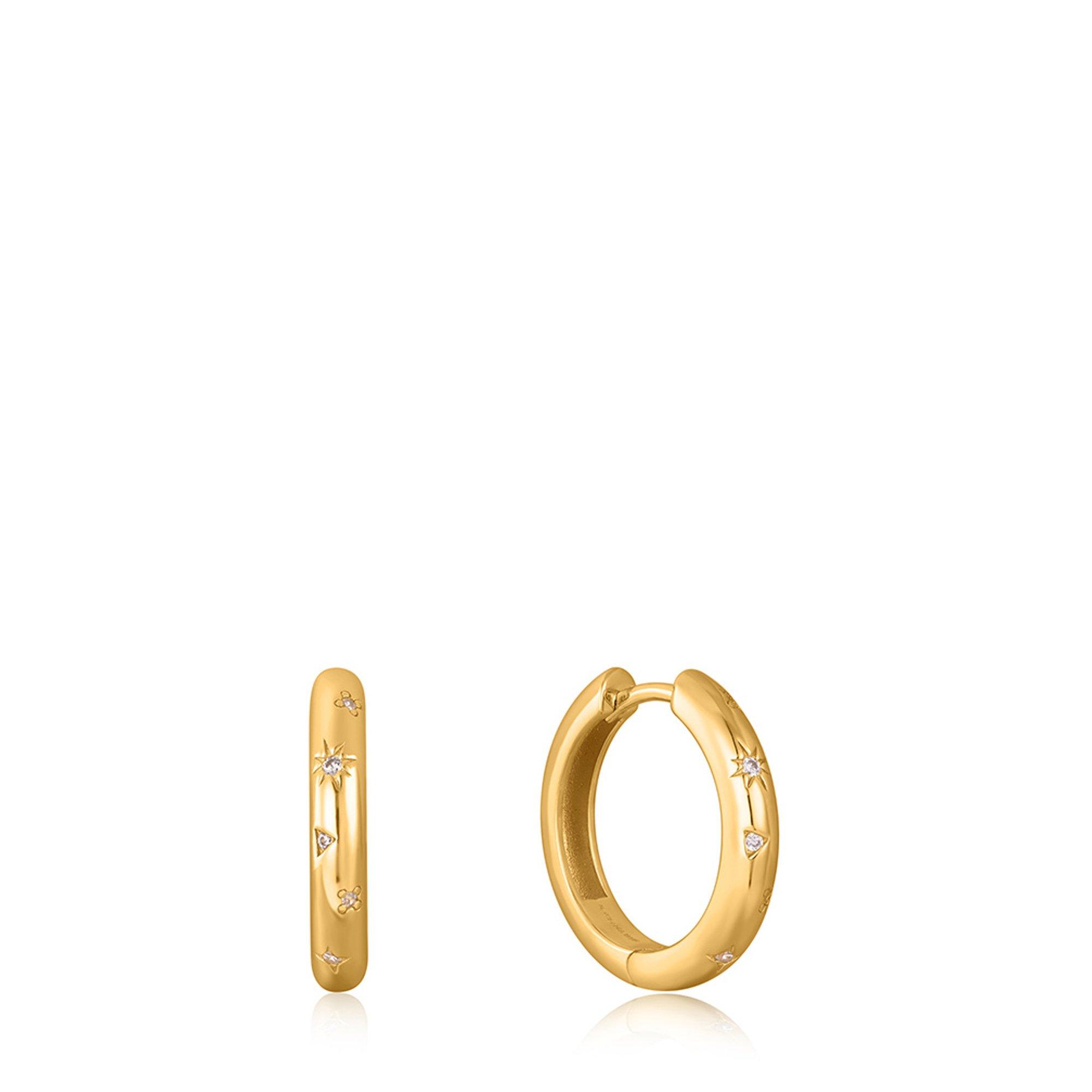 Diese goldglänzenden Ohrringe der Marke ANIA HAIE bestehen aus Sterlingsilber und präsentieren sich mit eingravierten Motiven, in denen sich funkelnde Kristalle befinden.