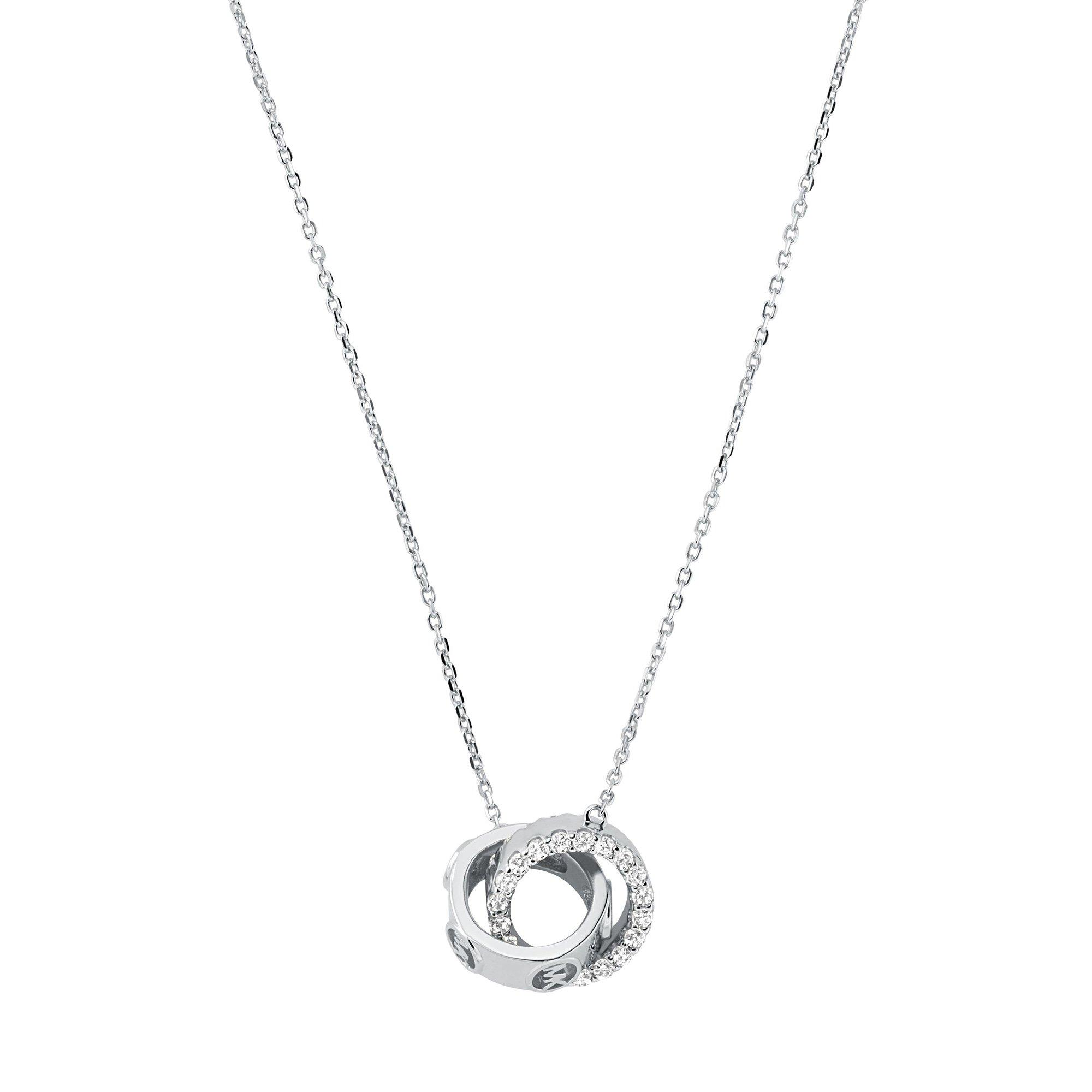 Diese filigrane Gliederhalskette der Marke MICHAEL KORS besteht aus hochwertigem Sterlingsilber. Das Herzstück bildet zwei verbundene Ringe, die mit funkelnden Zirkonia-Steinen und Marken-Logo versehen wurden.