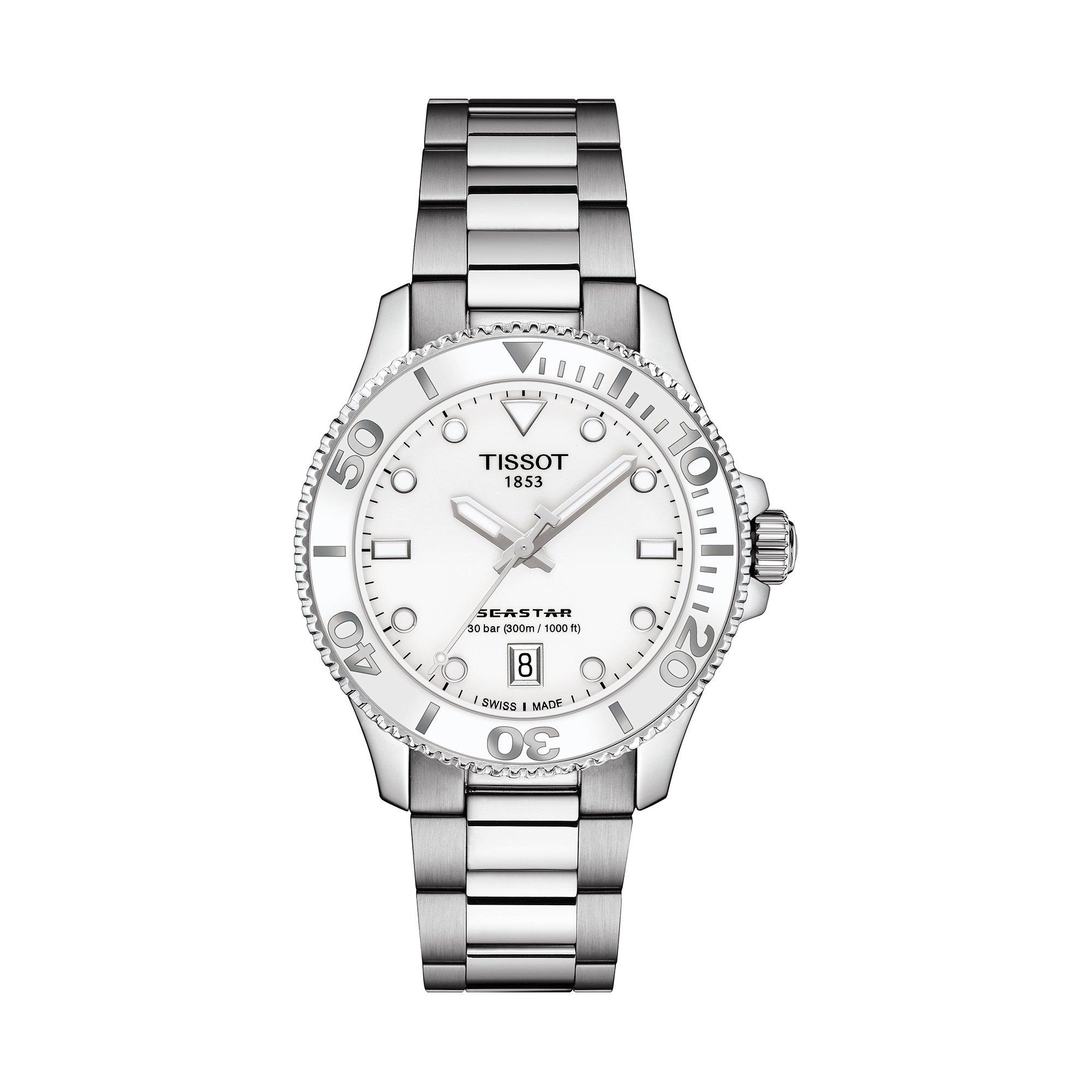 Sie fühlen es. Unter den Wellen herrscht Stille. Im kristallklaren Wasser sehen Sie die durch die Wasseroberfläche brechenden Sonnenstrahlen. In Ihrem Inneren: nichts als Ruhe. An Ihrem Handgelenk: die Tissot Seastar 1000 Quartz, Ihre Tür zur Unterwasserwelt. Mit 36 mm Durchmesser schafft die Seastar 1000 Quartz Vertrauen. Sie ist schick, vielseitig und für Tauchgänge in die Tiefen des Ozeans ebenso gemacht wie für den Grossstadtdschungel. Unabhängig davon, ob Sie das schwarze, blaue oder weißlackierte Zifferblatt wählen, kommt die Uhr mit einem Edelstahlgehäuse und -armband, einseitig drehbarer Lünette mit Mineralglas-Inlay, verschraubter Krone und einer Wasserdichtigkeit bis zu einem Druck von 30 bar (300 m). Wenn Sie möchten, können Sie das Armband schnell und einfach wechseln und durch ein orangefarbenes, weißes, hellblaues oder schwarzes Silikonarmband ersetzen. Verändern Sie Ihren Look und tauchen Sie in eine neue Welt ein!