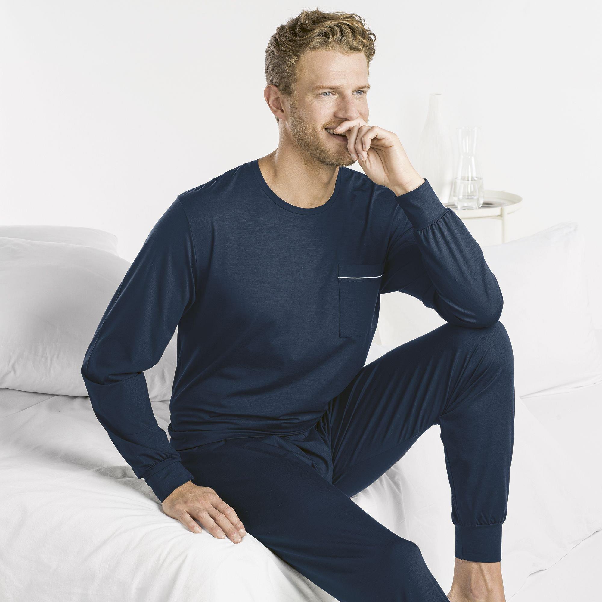 Der langärmlige Pyjama verspricht angenehme Nächte. Der hochwertige Pyjama passt sich jeder Bewegung an und bleibt selbst nach vielen Wäschen perfekt in Form. Er punktet vor allem durch seinen elegant akzentuierten Rundhalsausschnitt und das stilvolle und zeitlose Design. Feiner Jersey macht den Zweiteiler besonders bequem und überzeugt mit einem tollen Tragegefühl und einer idealen Passform. Der Stoff wird in der Schweiz gestrickt und nach hohen ökologischen Qualitätsanforderungen ausgerüstet.