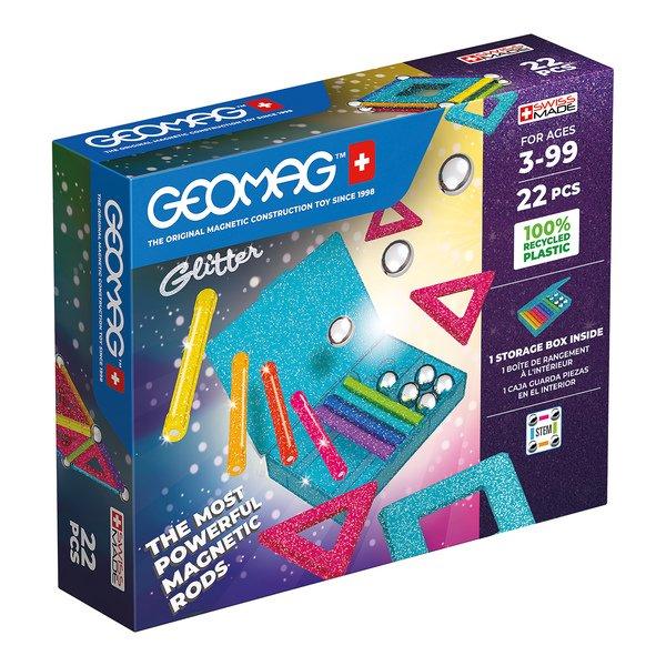 Magnetisches Konstruktionsspielzeug in glitzernden Farben und zu 100% aus recyceltem Plastik. Das Set beinhaltet: 8 Magnetstäbe, 8 Metallkugeln, 4 Triangel-Panel, 2 quadratische Panel. Alles praktisch versorgt in einer glitzernde Aufbewahrungsbox. GEOMAG - Made in Switzerland.