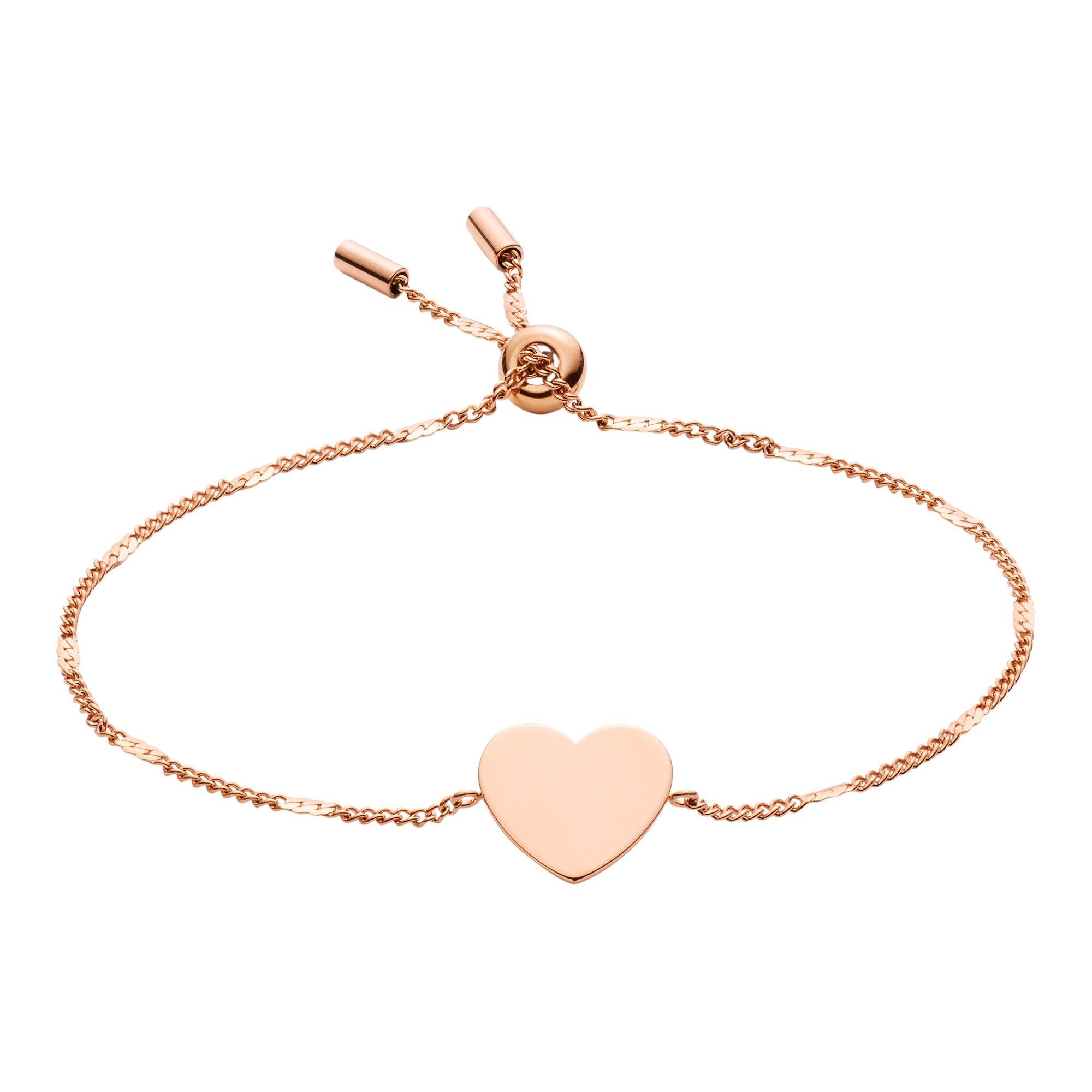 Dieses filigrane Armband der Marke Fossil besteht aus Edelstahl und präsentiert sich mit einem Herz-Anhänger und Schiebeverschluss, welcher das An- und Ausziehen des Schmuckstücks erleichtert.