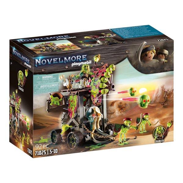 Auf ihrem Angriffsturm verarbeitet die Skelettarmee eine schleimähnliche Substanz zu gefährlichen Geschossen und Schleimpfützen. Zusätzlich wird der Donnerthron durch eine gefährliche Totenkopfbatterie geschützt, die Totenkopfgeschosse blitzschnell auf Gegner abfeuern kann. Gezogen wird der Turm auf Rädern von zwei gruseligen Skeletten. Ein aufregendes PLAYMOBIL-Spielset mit vielen Funktionen für spannende Spielabenteuer. Für noch mehr Spielspass kann der Angriffsturm mit Set 71027 Sal'ahari Sands - Mammut Attacke kombiniert werden.