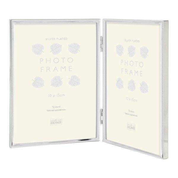 Ein eleganter, versilberter Fotorahmen aus glänzendem Metall mit flachem Profil und abgerundeten Kanten und einer eleganten grauen Rückseite.