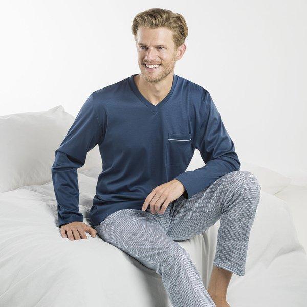 Dieses Pyjama-Set bietet Komfort und Stil für entspannte Stunden zu Hause. Das langärmlige Oberteil verfügt über einen V-Ausschnitt und eine Brusttasche mit kontrastierendem Besatz, was dem Design ein dezentes Detail verleiht. Die Pyjamahose ist mit einem dezenten geometrischen Muster versehen, das diesem klassischen Schlafanzug eine moderne Note verleiht.