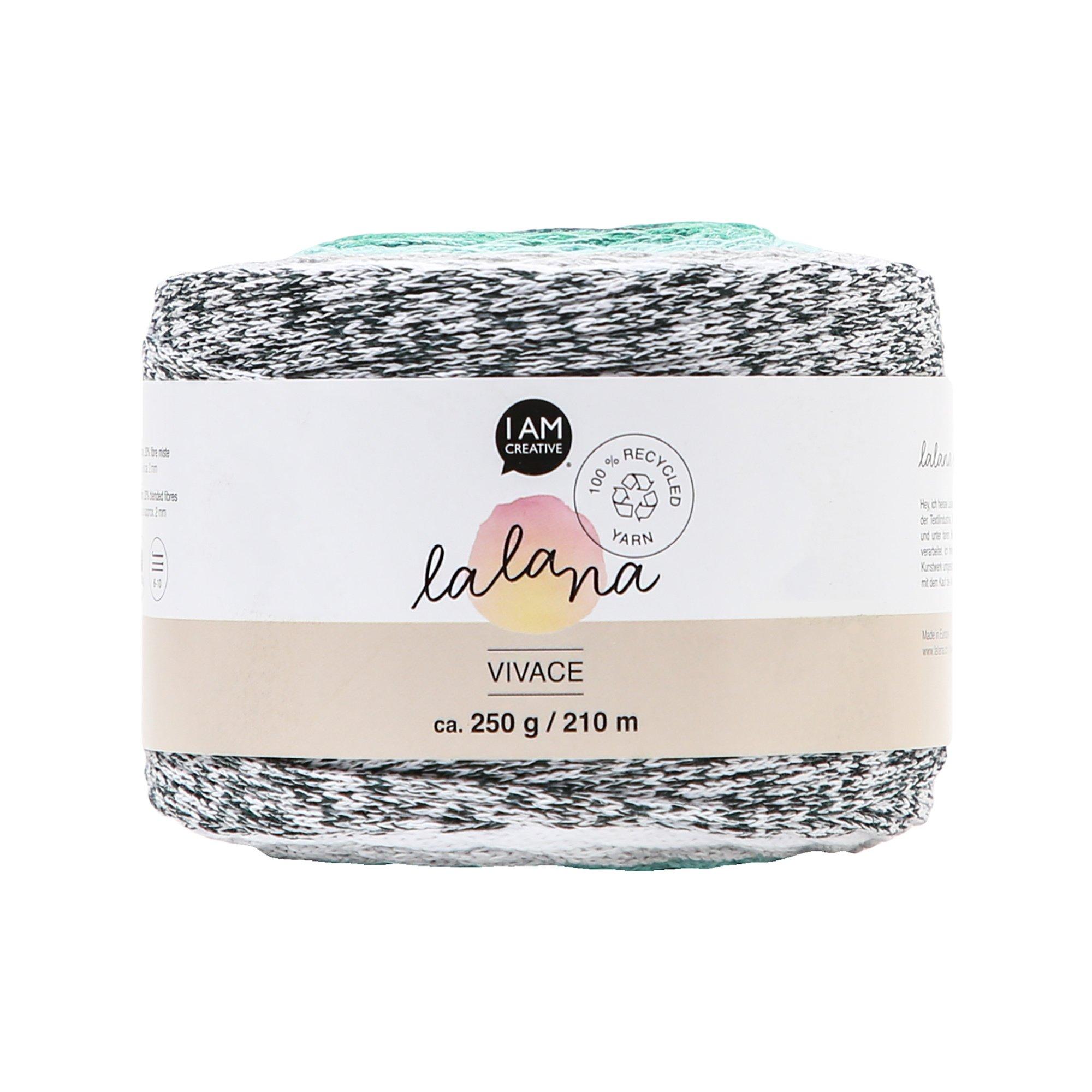 Lalana Vivace ergibt super schöne Farbverläufe! Das receyclete Garn aus 80 % Baumwolle und 20 % Mischfasern ist softig weich und hervorragend zur Verarbeitung von Häkel- Stricktaschen, Schals, Decken usw. Mit diesem Garn im Kettenstil können fantasievolle Ideen in die Tat umgesetzt werden. Das Garn reicht für ein Häkelnetz von ca. 32×30 cm.