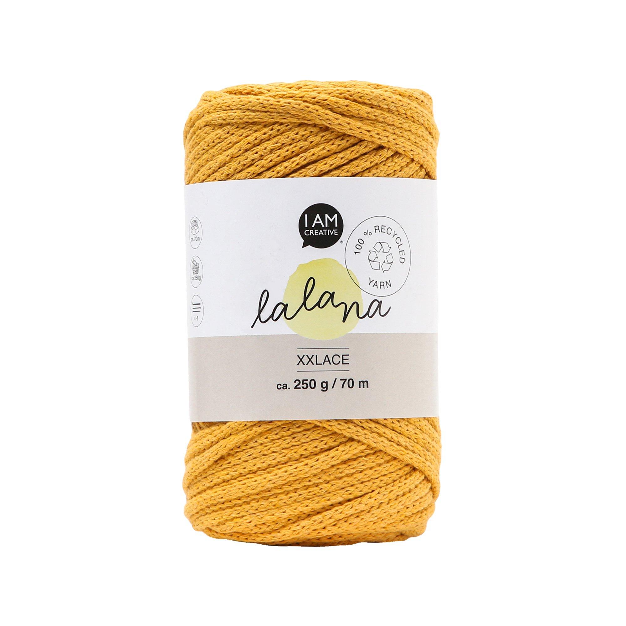 Lalana XXlace ist, wie der Name schon sagt, ein dickeres Kettengarn, mit welchem alles gemacht werden kann. Häkeln, stricken, knüpfen in schönster Farbenpracht. Es ist ein weiches receycletes Garn und ergibt modische Taschen, Necessaires, Körbchen, Kissen usw., zum Häkeln, Stricken, Knüpfen (ohne auskämmen). Netz-, Mode- oder Badetaschen oder Necessaires, aber auch luftige Pullover und dünne Makrameedekorationen ohne Fransen.