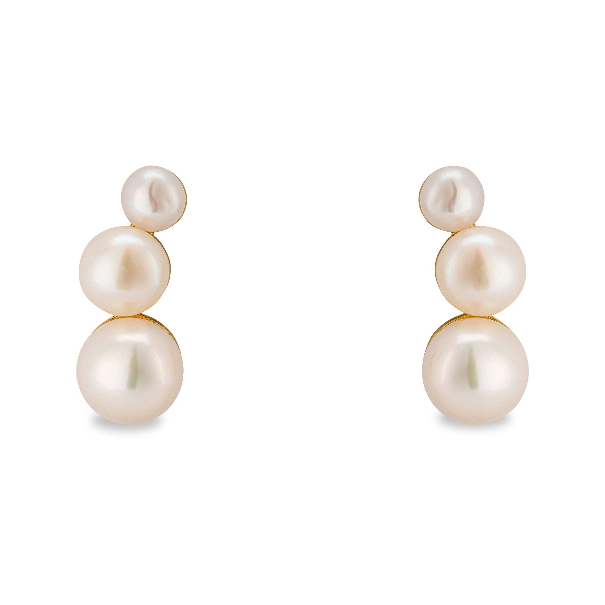 Die Ohrringe von Puro setzen die Eleganz von Perlen zeitlos in Szene. Jeder Ohrstecker mit drei unterschiedlich grossen Perlen hat eine Poussette aus Gold.