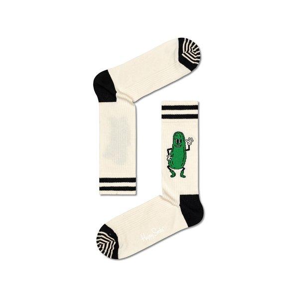 Diese wadenlangen Socken zeigen ein verspieltes Gurkenmotiv, das jedem Outfit eine lustige Note verleiht. Das Design umfasst kontrastierende schwarze Akzente an Ferse, Zehen und Bündchen sowie zwei schwarze Streifen am oberen Rand des Bündchens für einen sportlichen Look. Die gerippte Textur sorgt für einen bequemen Sitz.
