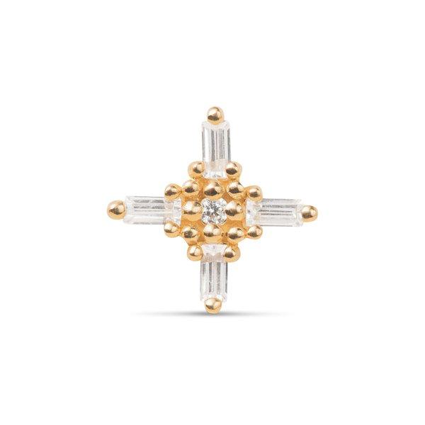 Dieser Ohrpiercing in Form eines Sterns der Marke Giahi besteht aus 14 Karat Gelbgold. Vier rechteckige Zirkonia-Steine und ein kleiner Zirkonia-Stein in der Mitte lassen das Schmuckstück funkeln.